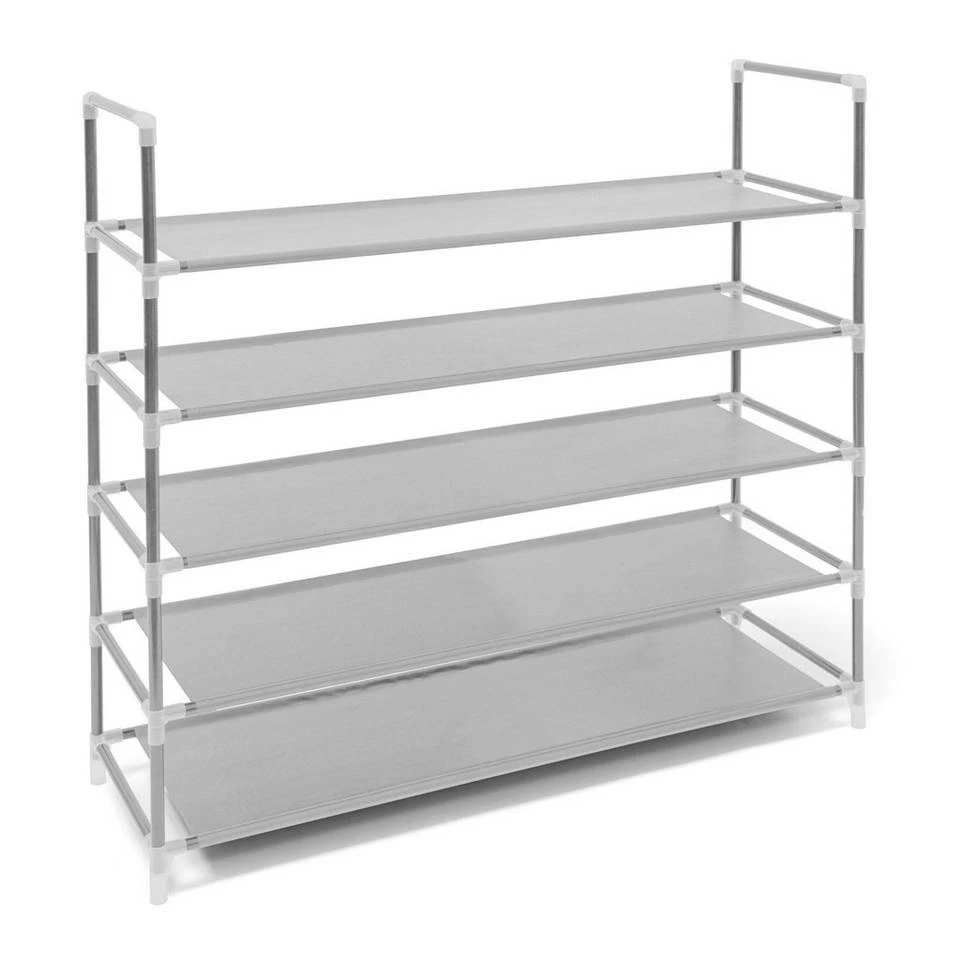 Schuhständer aus stabilem Metallgestell Stellen Sie Ihre Schuhe auf diese praktische, durch ihren Minimalismus überzeugende Schuhablage. Jeder der 5 Böden ist aus straff gespanntem Vlies-Gewebe gefertigt und bietet Platz für 4 Paar Schuhe. Das graue Schuhregal passt in jeden Flur und jedes Treppenhaus. Das Gestell besteht aus ineinander gesteckten Stahlrohren, die sehr leicht und trotzdem äußerst stabil sind. Dank der beiden Griffe an den Seiten können Sie das Schuhregal somit ohne Probleme zur Seite oder aus dem Weg räumen.