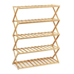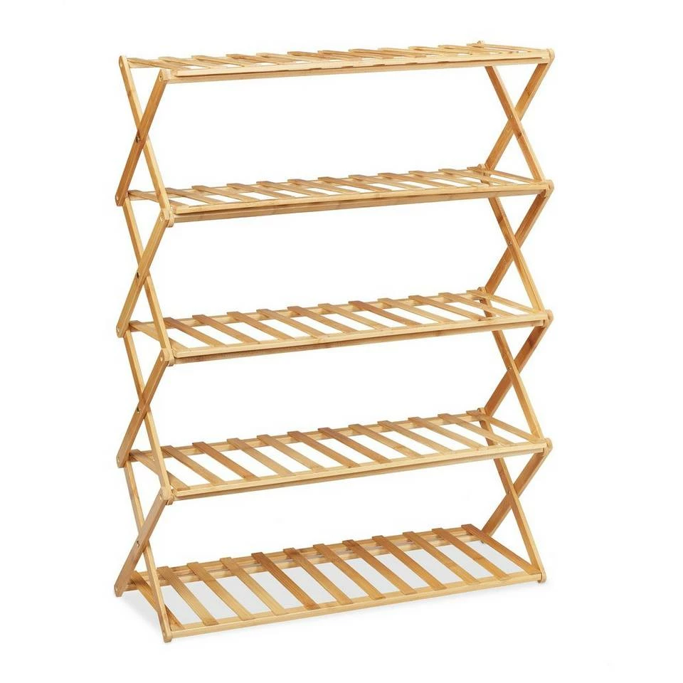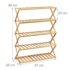 Schuhregal mit modernem Look Das schicke Schuhregal aus Bambus bietet auf seinen fünf Ebenen Aufbewahrung und Organisation für ca. 15 Paar Schuhe. Durch die schmale Form passt das Bambusregal perfekt in Diele und Flur. Dank dem genialen faltbaren Design kann der Schuhständer schnell und platzsparend verstaut werden. Dadurch ist die Schuhablage auch unterwegs im Wohnwagen und beim Camping immer dabei. Hier sorgt der Schuhturm für Ordnung im Zelt und Wohnmobil, damit ihre Schuhe, Stiefel und Sneaker nicht herumliegen.