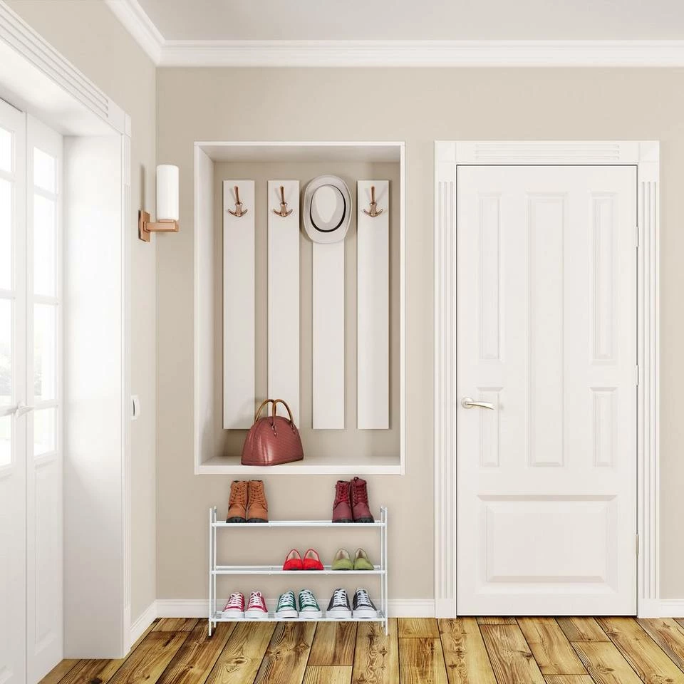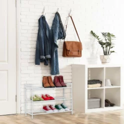 - Design: Schlichter Schuh-Organizer aus weißem Metall ideal für Flur, Wohnbereich und Treppenhaus