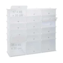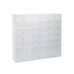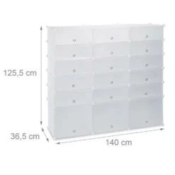 Regalsystem für die Schuhaufbewahrung Sie sind kein Fan schwerfälliger Schuhregale, die sich nur mithilfe vieler freiwilliger Hände bewegen lassen? Mit diesem Stecksystem ersparen Sie sich viel Stress. Die Wände, Böden und Türen lassen sich mithilfe der Steckverbindungen zusammenbauen – und zwar genau so, wie es Ihrem Geschmack entspricht. Mindestens 36 Paar Schuhe finden in dem Standregal Platz, das Sie mit oder ohne Türen nutzen können. In jedem Fall wissen Sie dank der transparenten Türen sofort, in welchem Fach sich Schuhe befinden. Die 3 größeren Fächer bieten sogar genügend Raum für Stiefel.