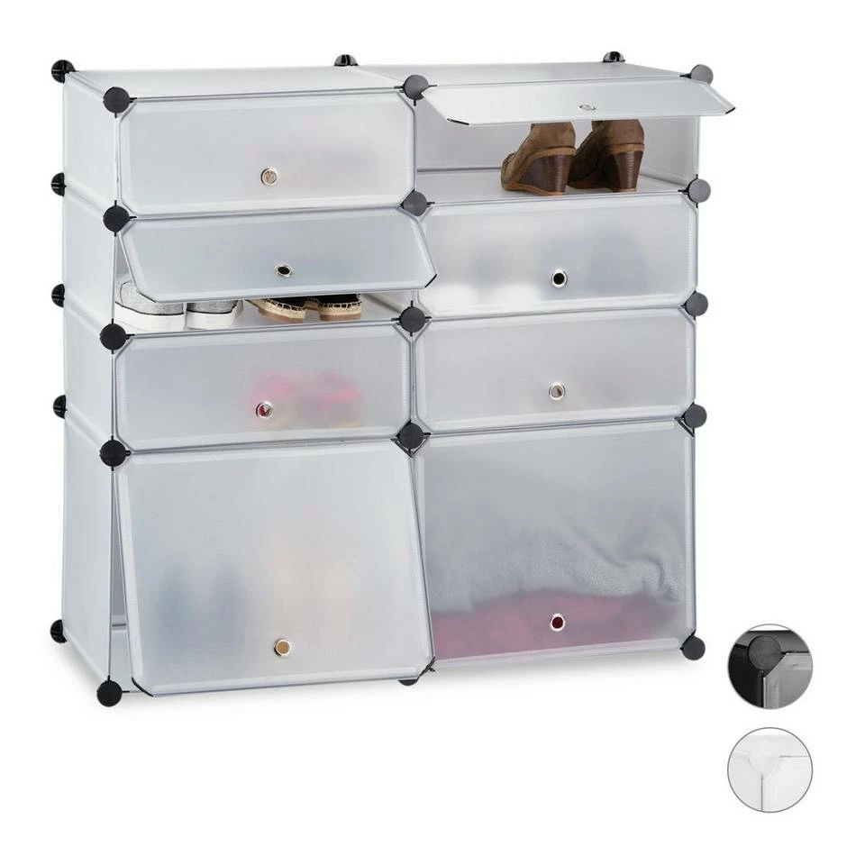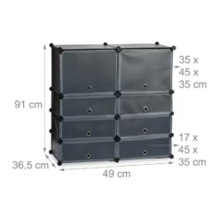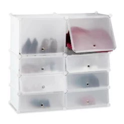 Kunststoff Schuhregal für viele Schuhe Der Schuhschrank zum Stecken ist ideal für die ganze Familie. Die besonders tiefen Fächer bieten Platz für große Schuhe oder für zwei Reihen Kinderschuhe. Durch die hohen Fächer finden auch Damenstiefel genügend Platz. Das praktische Regalstecksystem lässt sich einfach auf- und abbauen und kann durch die flexiblen Steckverbindungen auch in eine andere Form gebracht werden. Die abwaschbaren Kunststoffplatten sind gerade bei nassen Schuhen praktisch, da ein Reinigen schnell und leicht von der Hand geht.