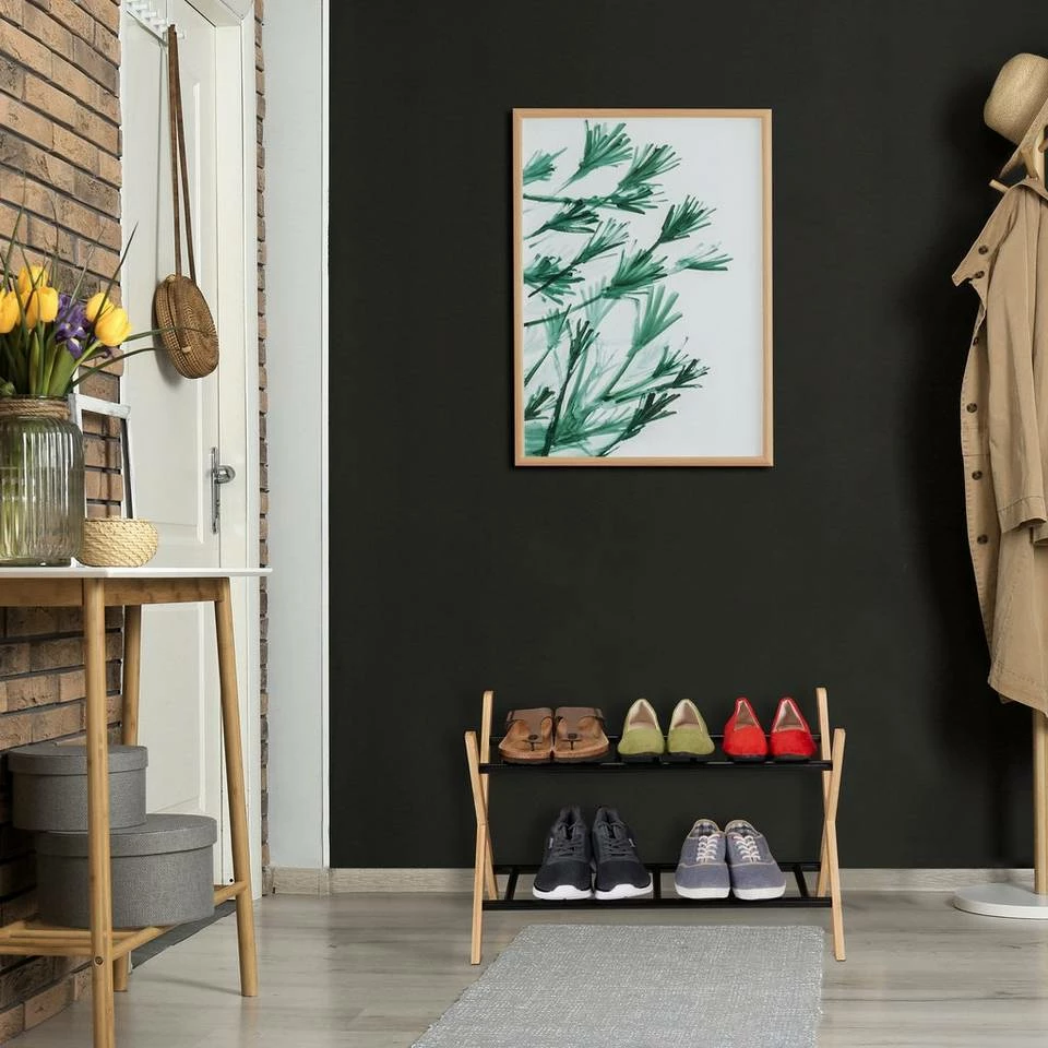 Schuhregal mit 2 Ebenen Das elegante Schuhregal ist die ideale Lösung für jeden Flur und jede Diele. Das moderne Design ist der perfekte Blickfang für jeden Gast direkt beim Schuhe ausziehen. Damit bietet dir der hochwertige Schuhständer aus Metall und Bambus eine stabile und platzsparende Lagerung für alle Deine Schuhe, Sneaker und Stiefel. Durch die rutschfesten Füße schont der schicke Schuhständer auch deine Böden und die kompakte Form fügt sich in alle Ecken und Nischen auch bei wenig Platz.