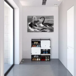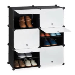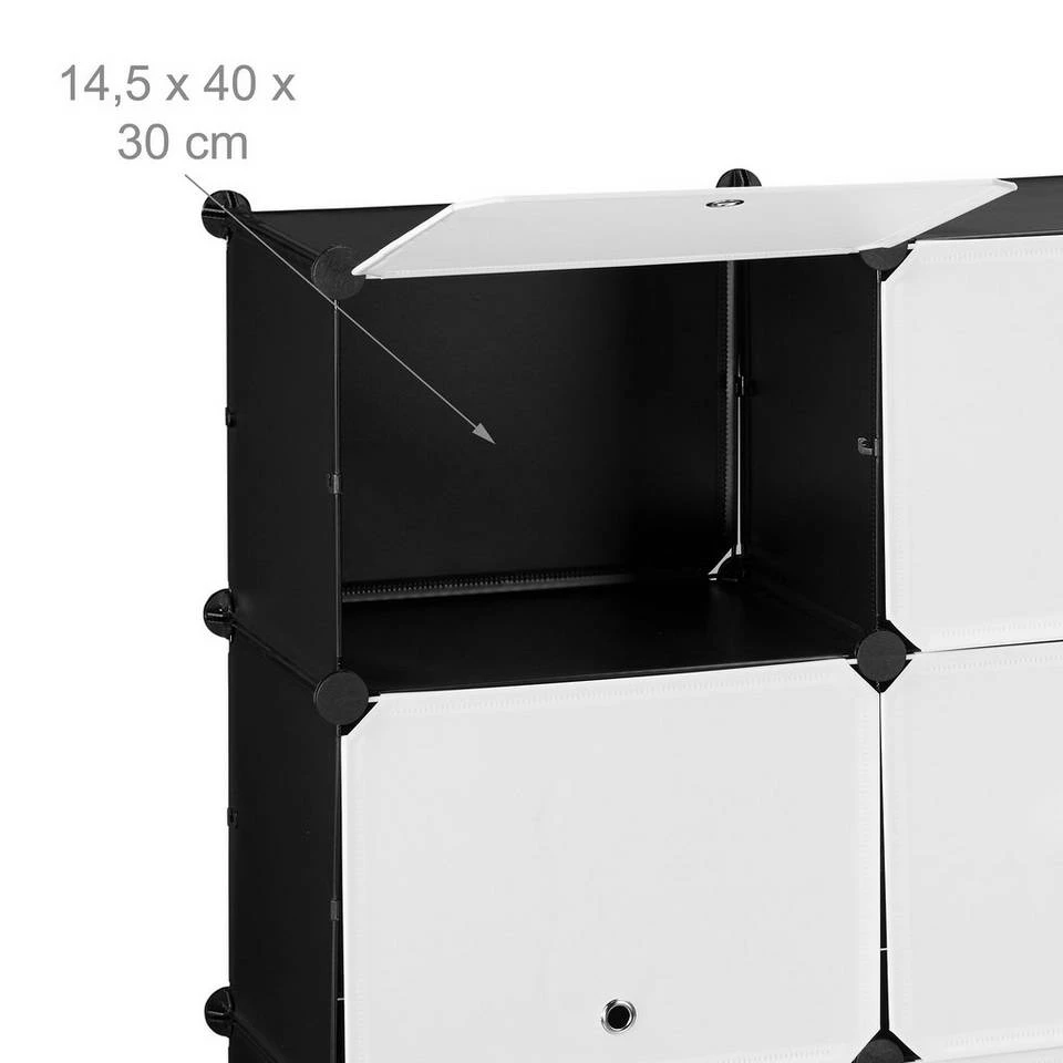 Praktisches Kunststoffregal für Schuhe Hast Du genug von Schuhbergen, die sich im Eingangsbereich türmen? Mach Dir das Leben etwas leichter mit diesem Schuhschrank. In 12 Fächern hast Du genug Platz, um deine Schuhe zu verstauen und für Ordnung zu sorgen. Die Schuhkommode überzeugt durch ihr zweifarbiges Design in Schwarz-Weiß. Das Kunststoffregal ist leicht und dank seines modularen Aufbaus beliebig erweiterbar. Der Bausatz lässt sich schnell zusammen setzen und ist dank seines geringen Gewichts leicht transportierbar.