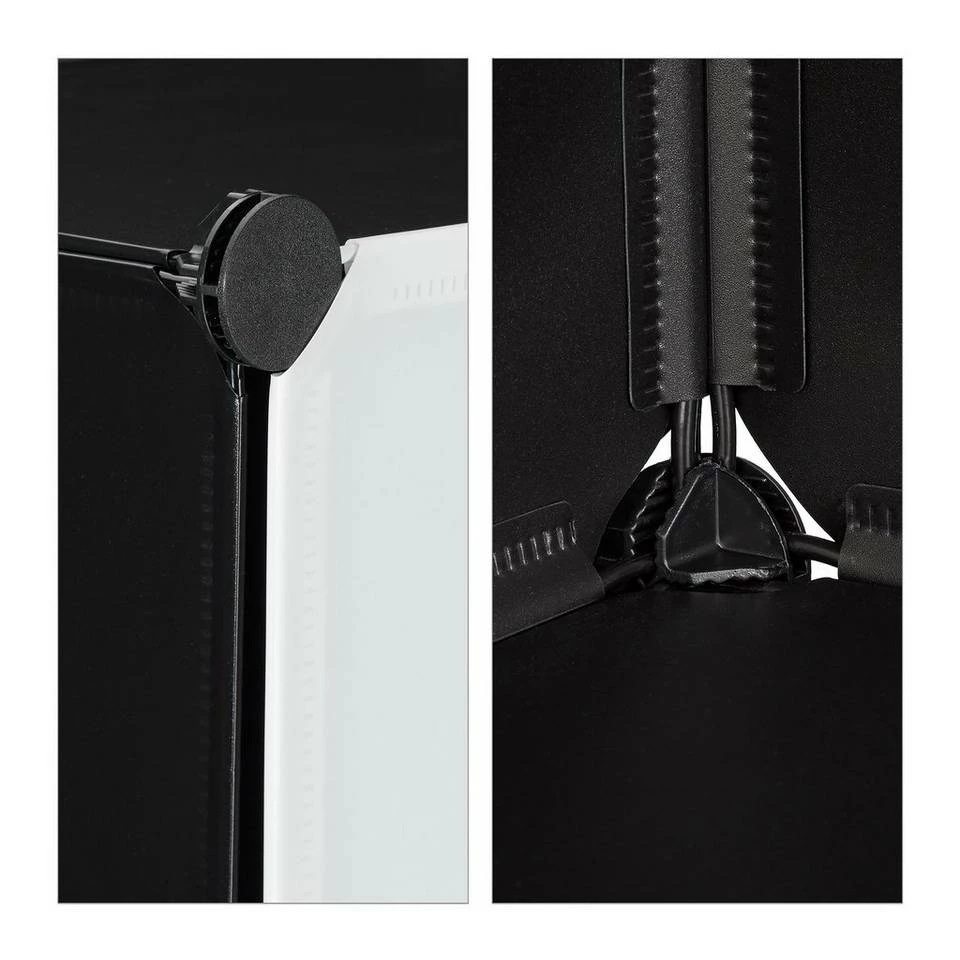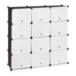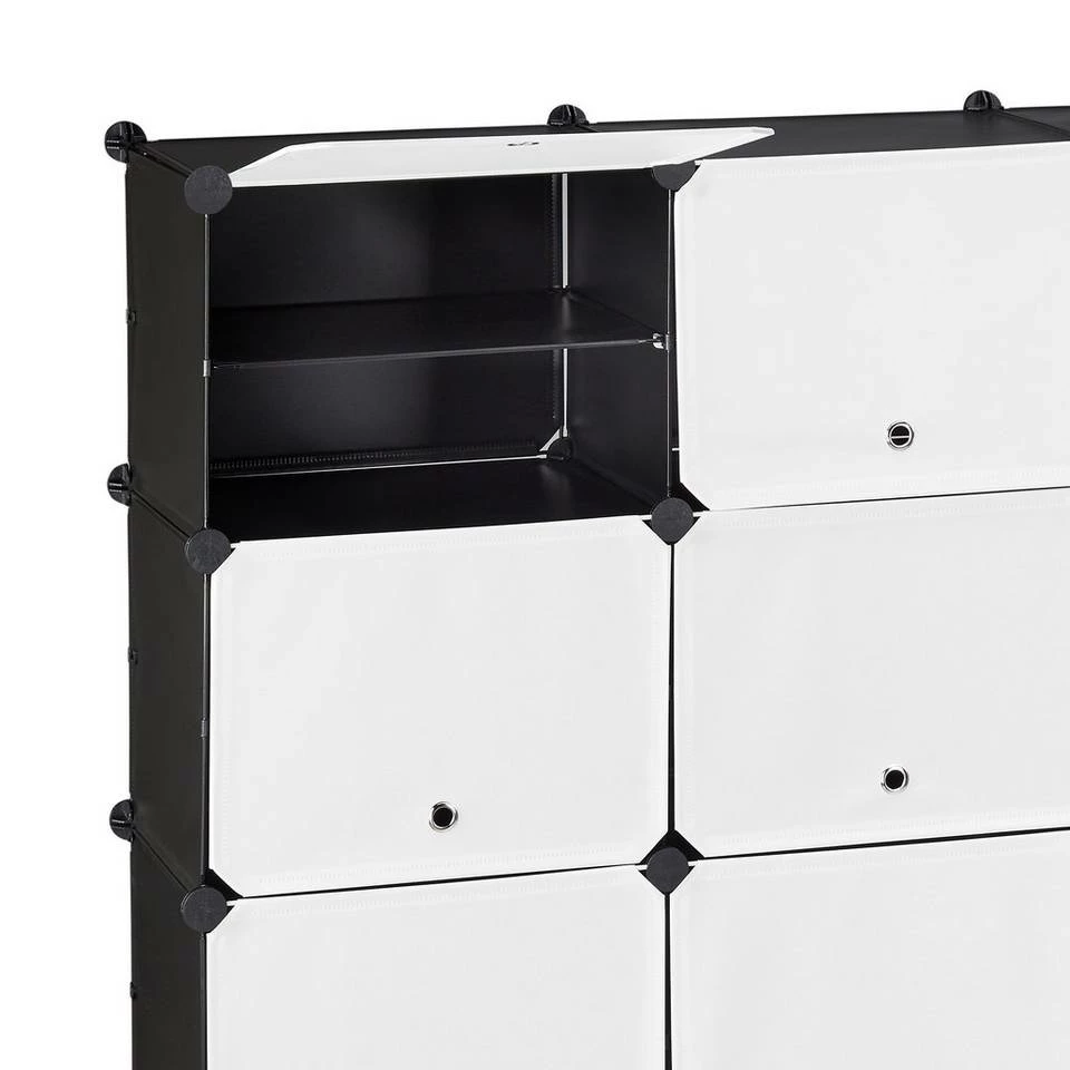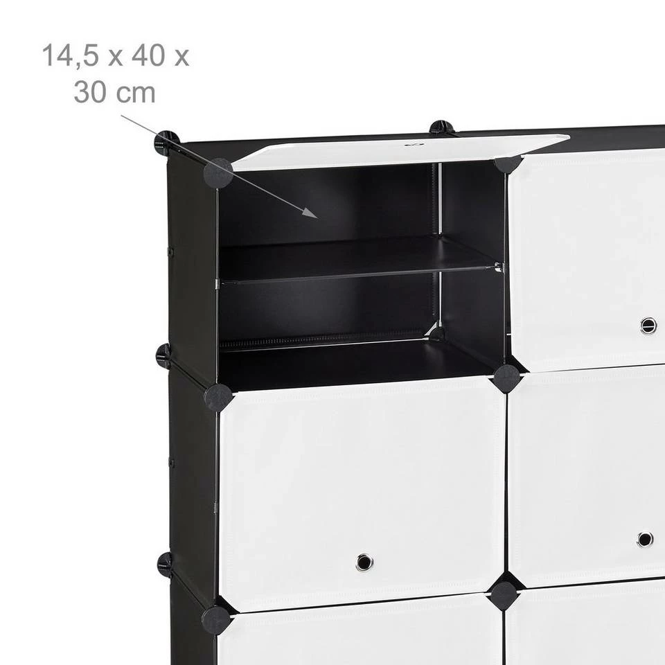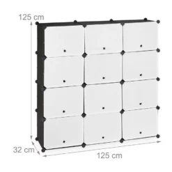 Schuhschrank mit 24 Fächern Genug von Schuhbergen, die sich im Eingangsbereich türmen? Dieser praktische Schuhschrank sorgt mit 24 Fächern für genug Platz, um Schuhe ordentlich und platzsparend zu verstauen. Das Steckregalsystem überzeugt durch ein zurückhaltendes Design in Schwarz-Weiß. Dank seines modularen Aufbaus ist das Steckregal beliebig variier- und erweiterbar und bietet Platz für etwa 48 Paar Schuhe. Das Würfelregal lässt sich schnell zusammen setzen und ist dank seines geringen Gewichts leicht transportierbar.