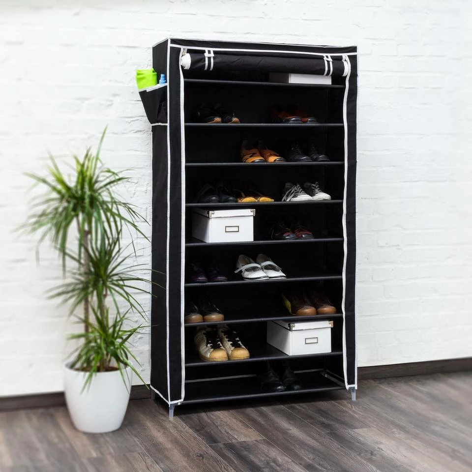 Der Schuhschrank, in dem alle Schuhe Platz finden Mit diesem hohen, geräumigen Schuhschrank schaffen Sie endlich Platz im Flur. Auf jede der 9 Ablagen können abhängig von ihrer Größe bis zu 5 Paar Schuhe abgestellt werden. Das sind insgesamt bis zu 45 Paar! Dank des Stoffbezugs aus robustem Vlies sowie dem Reißverschluss sind diese geschützt vor Staub und Schmutz. Damit eignet sich das Stoff-Schuhregal auch ideal zur Lagerung von weniger oft benutzten Schuhen im Keller oder auf dem Dachboden. Durch das simple Stecksystem erfolgt der Aufbau schnell und unkompliziert.