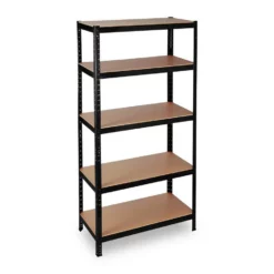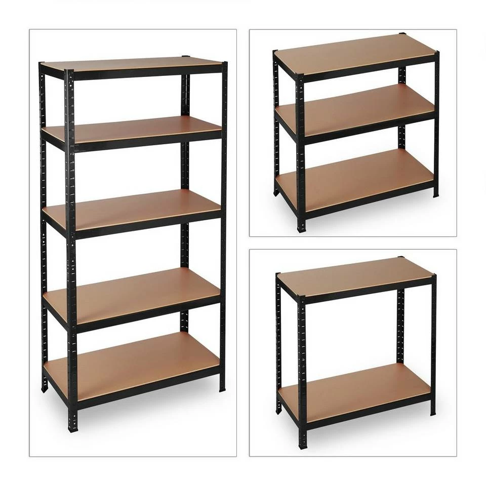 Praktisches Lagerregal mit Stecksystem Ob im Heimgebrauch oder Profibereich, das robuste Lagerregal ist ideal zur Aufbewahrung schwerer Gegenstände. Nutzen Sie das Steckregal im Keller oder Abstellraum für Werkzeug, Kisten und mehr oder in der Werkstatt für schweres Material und Zubehör. Die abgerundeten Kanten der Metallstreben sind dabei ebenso vorteilhaft wie die robusten, 6,8 mm dicken MDF-Regalbretter. Diese sind um ein Vielfaches belastbarer als herkömmliche Holzspanplatten. Wählen Sie die Höhe der 5 Regalebenen selbst aus. Tipp: Das praktische Stecksystem benötigt keinerlei Schrauben, daher funktioniert der Aufbau schnell und einfach. Sie benötigen einen Gummihammer. Bauen Sie das Regal mit Handschuhen auf. Unter Umständen brauchen Sie einen Schraubenzieher, um die Zinken leicht vorzubiegen.
