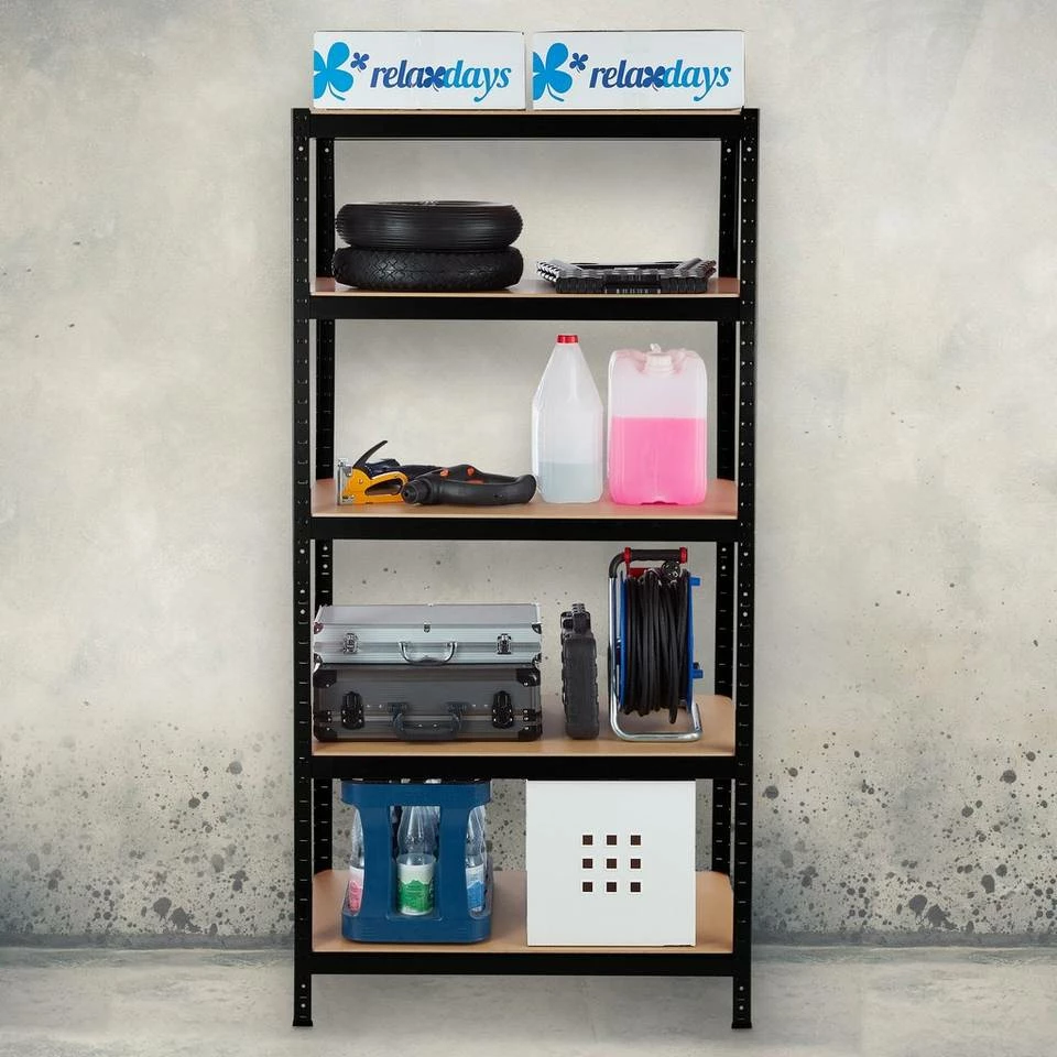 - Basics: Schwarzes Regal – Traglast gesamt: ca. 1325 kg – Je Ebene: ca. 265 kg – HBT ca. 180x90x60 cm
