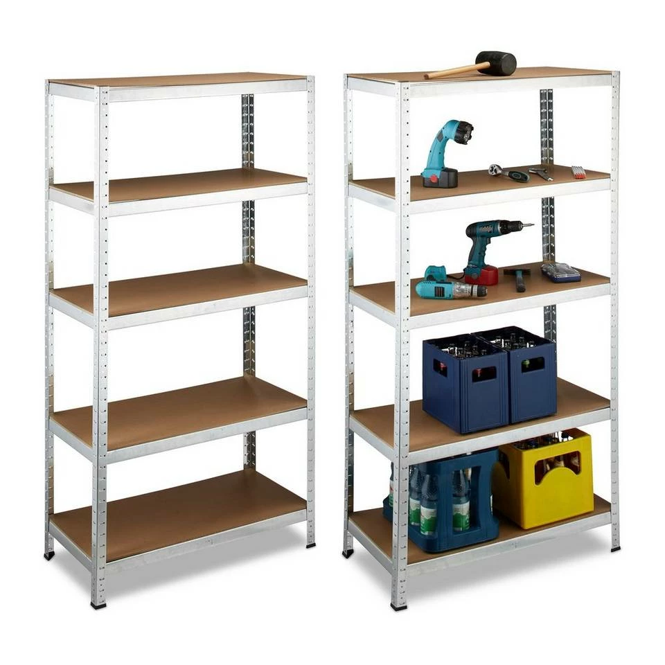 2 platzsparende Schwerlastregale für Keller & Co Die Schwerlastregale bieten optimalen Stauraum auch bei wenig Platz. In Keller, Garage, Garten oder Lagerraum ist es daher vielseitig einsetzbar. Sortieren Sie Werkzeug, Reifen, Getränkekisten und andere schwere Gegenstände bequem in die 5 Böden. Deren jeweilige Höhe können Sie dabei individuell einstellen. Das Lagerregal ist besonders stabil gebaut. Es trägt bis zu 1325 kg. Schutzkappen aus Kunststoff sorgen dafür, dass der Untergrund geschont wird. Der Aufbau erfolgt schnell und ohne Werkzeug. Sie benötigen lediglich einen Gummihammer und Handschuhe.