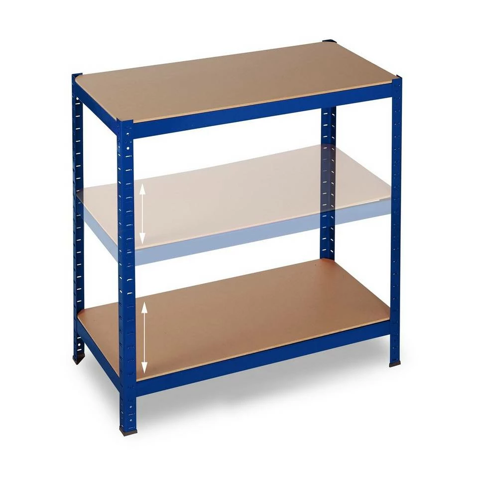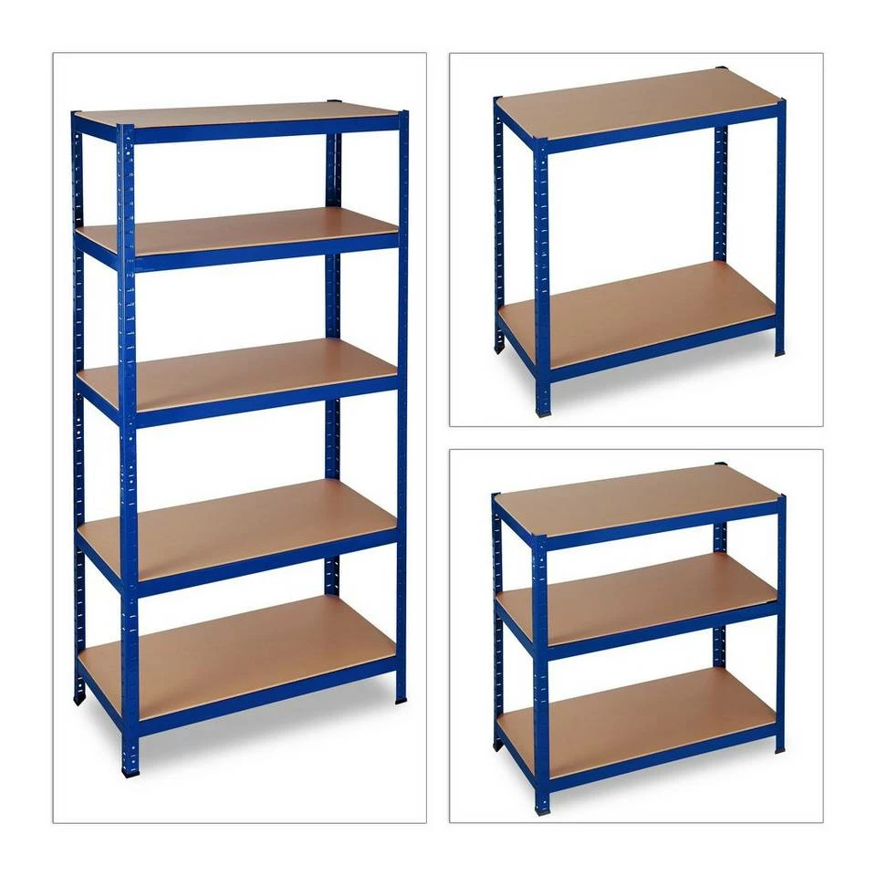 Blaues Haushaltsregal mit 5 Regelböden Das hohe und massive Lastregal ist vielseitig verwendbar – ob für Werkzeug und Kisten in Garage, Werkstatt oder Dachboden oder für Getränke und Vorräte in Abstell- und Speisekammer. Bei Bedarf können Sie das Regal auch teilen und Sie bekommen 2 niedrige Regale, die auch praktisch als Werkbänke Verwendung finden. Das robuste Metall des Steckregals ist form- und druckbeständig und sorgt mit den besonders dicken MDF-Böden für Stabilität. Die Höhe der Regalebenen ist ganz individuell wählbar. Tipp: Das praktische Stecksystem benötigt keinerlei Schrauben, daher funktioniert der Aufbau schnell und einfach. Sie benötigen einen Gummihammer. Bauen Sie das Regal mit Handschuhen auf. Unter Umständen brauchen Sie einen Schraubenzieher, um die Zinken leicht vorzubiegen.