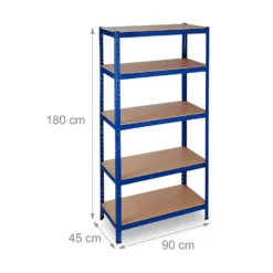 - Basics: Blaues Regal – Traglast gesamt: ca. 1325 kg – Je Ebene: ca. 265 kg – HBT: ca. 180 x 90 x 45