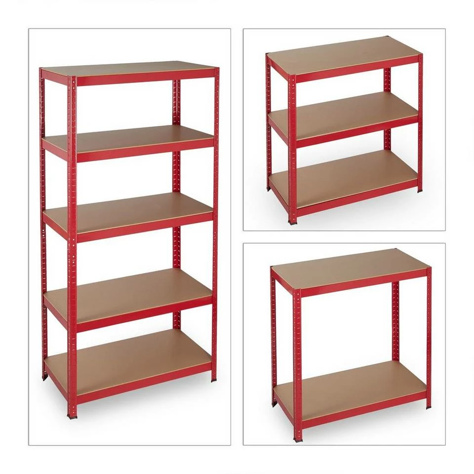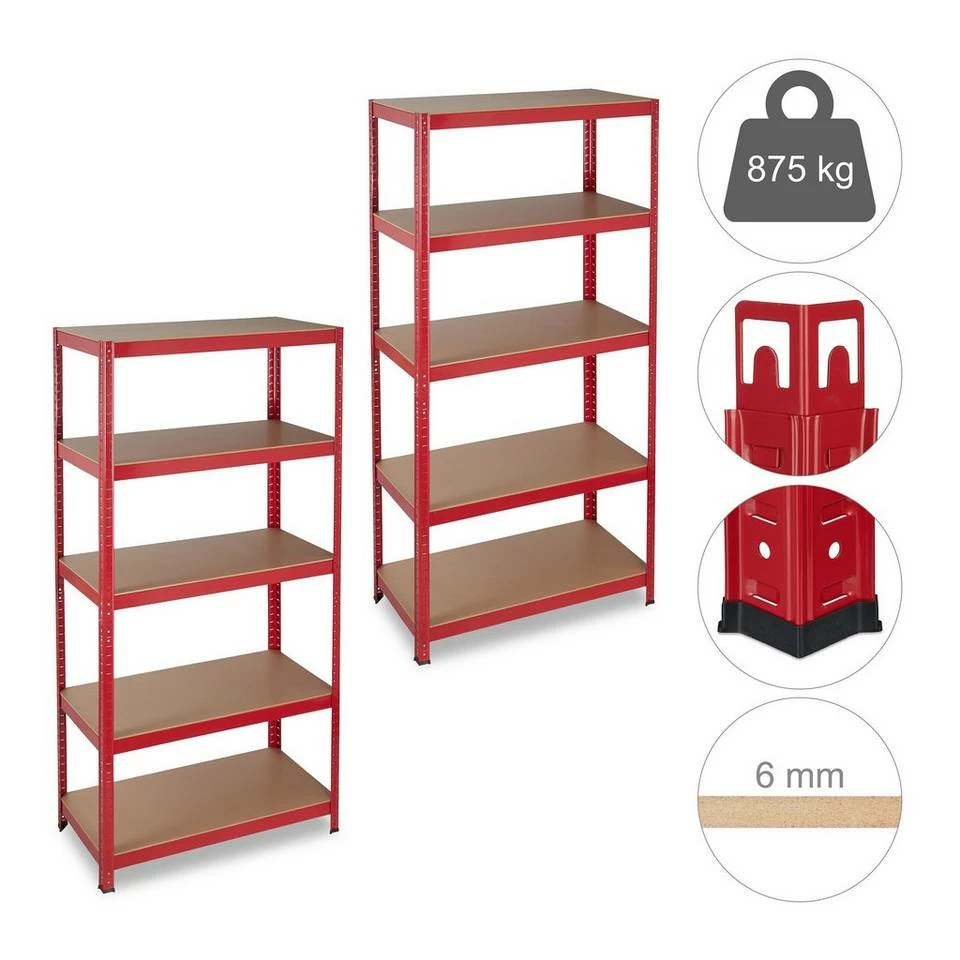 - Basics: Rotes Regal – Traglast gesamt: ca. 875 kg – Je Ebene: ca. 175 kg – HxBxT: ca. 180x90x45 cm