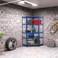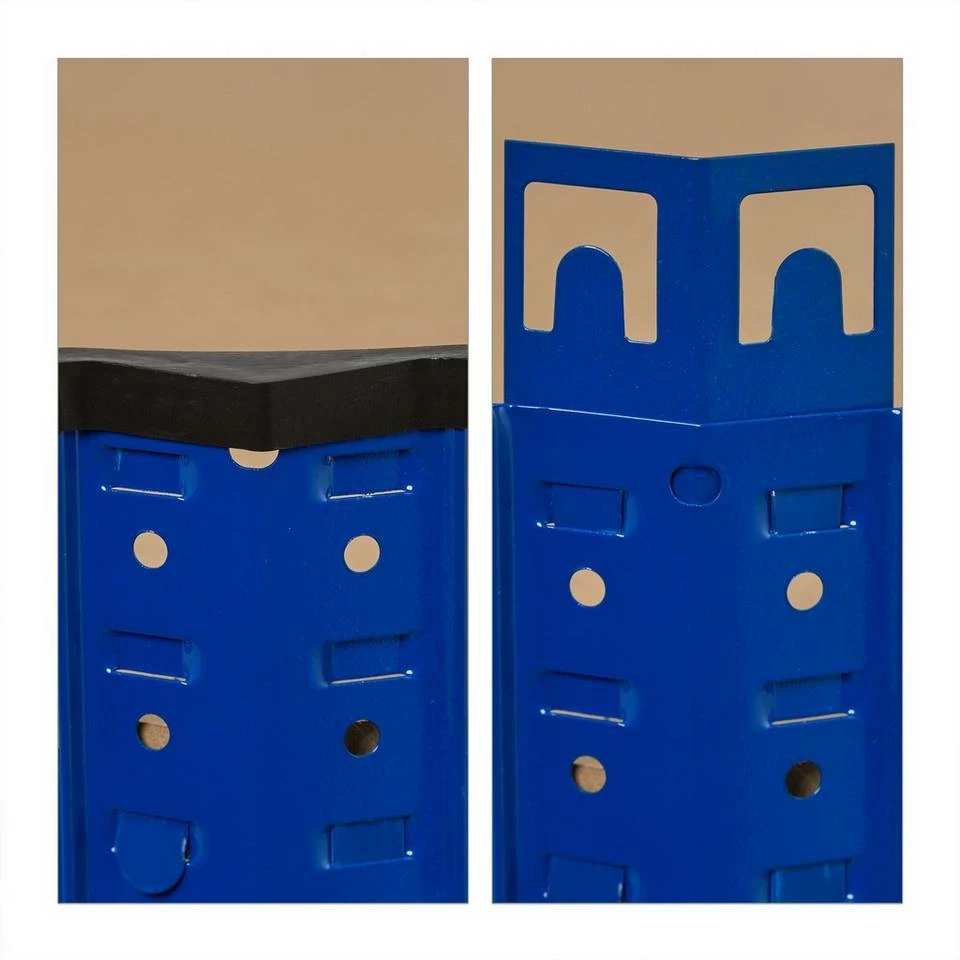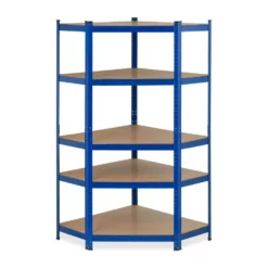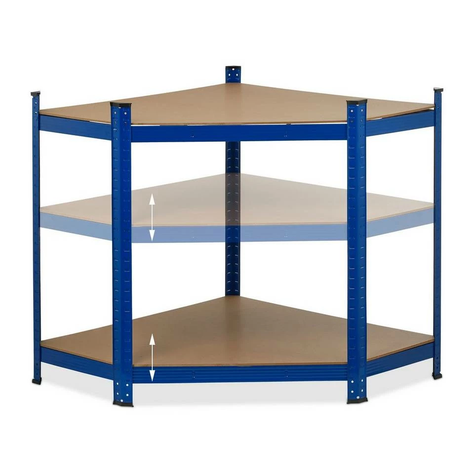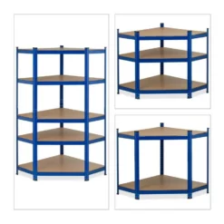Blaues Eck Schwerlastregal mit 5 Böden Sie suchen Stauraum und wollen auch den Bereich in den Ecken sinnvoll nutzen? Dieses verzinkte Eck Schwerlastregal zum Stecken gibt Ihnen die Möglichkeit dazu. Das Metall Eckregal in Blau spart Platz in der Werkstatt, im Keller, in der Garage oder im Garten und bietet mit seinen fünf variabel einsetzbaren MDF-Böden ausreichend Stauraum für Werkzeuge, Lebensmittel, Ersatzteile oder Gartengeräte. Das XL Lager Regal aus Stahl ist äußerst stabil und besticht durch seine hohe Traglast von 875 kg. Tipp: Das praktische Stecksystem benötigt keinerlei Schrauben, daher funktioniert der Aufbau schnell und einfach. Sie benötigen einen Gummihammer. Bauen Sie das Regal mit Handschuhen auf. Unter Umständen brauchen Sie einen Schraubenzieher, um die Zinken leicht vor zu biegen.