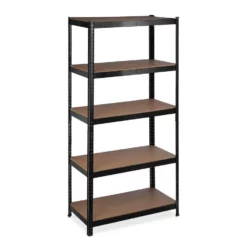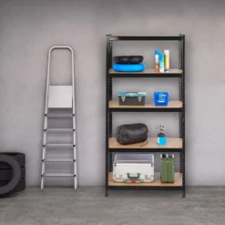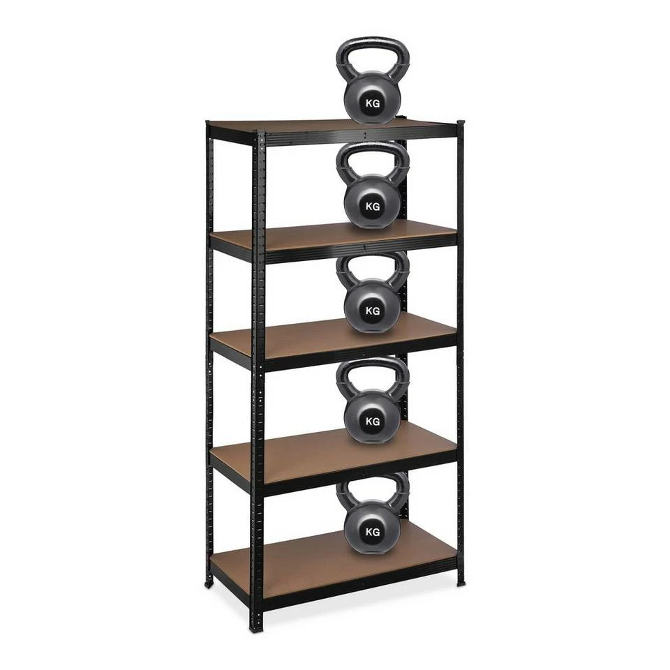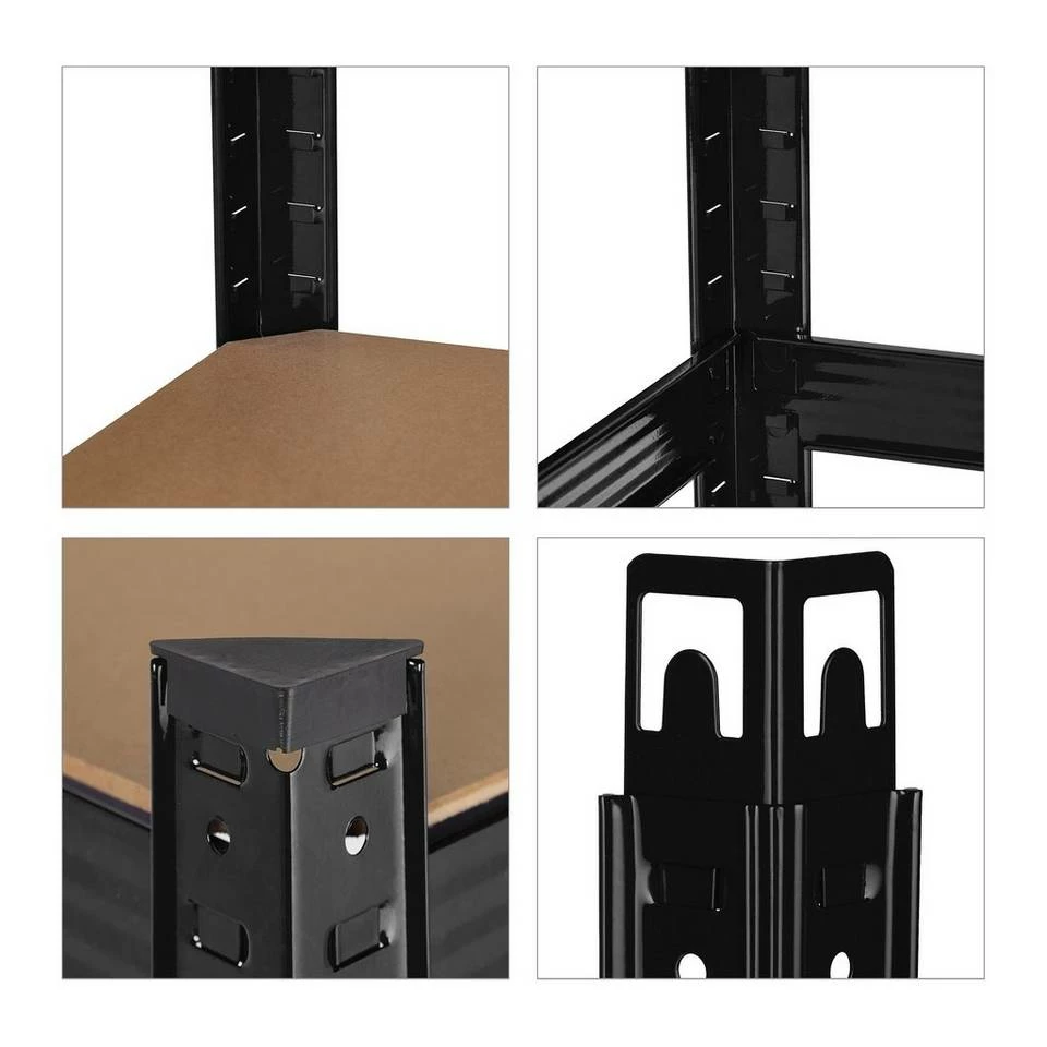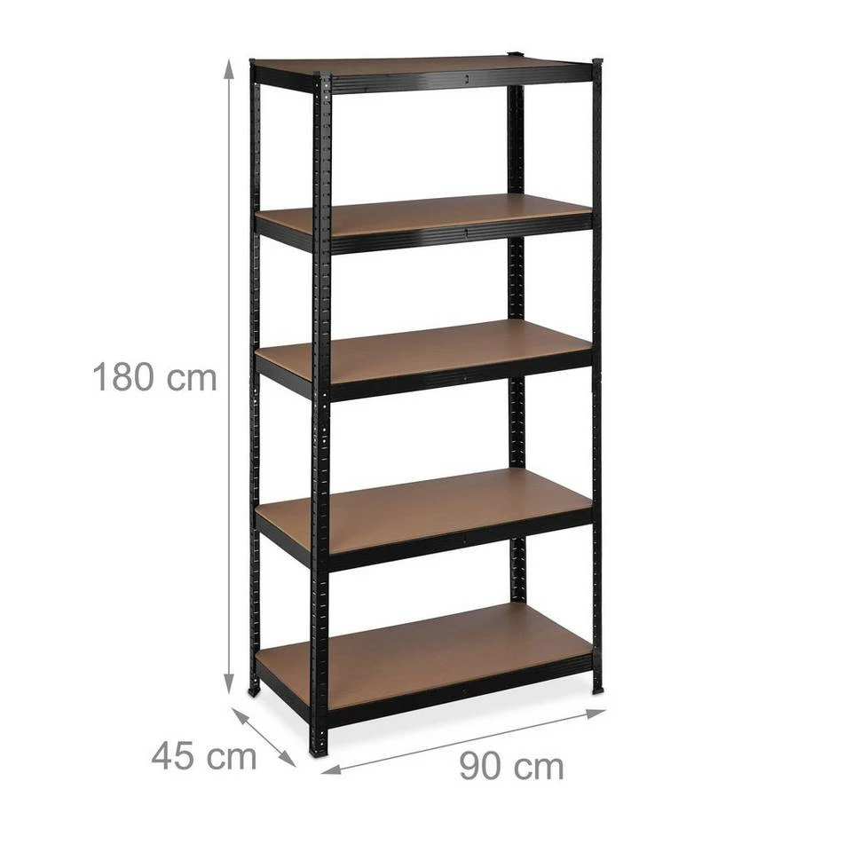- Basics: Schwarzes Regal – Traglast gesamt: ca. 1325 kg – Je Ebene: ca. 265 kg – HBT: ca. 180x90x45 cm