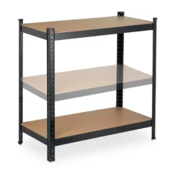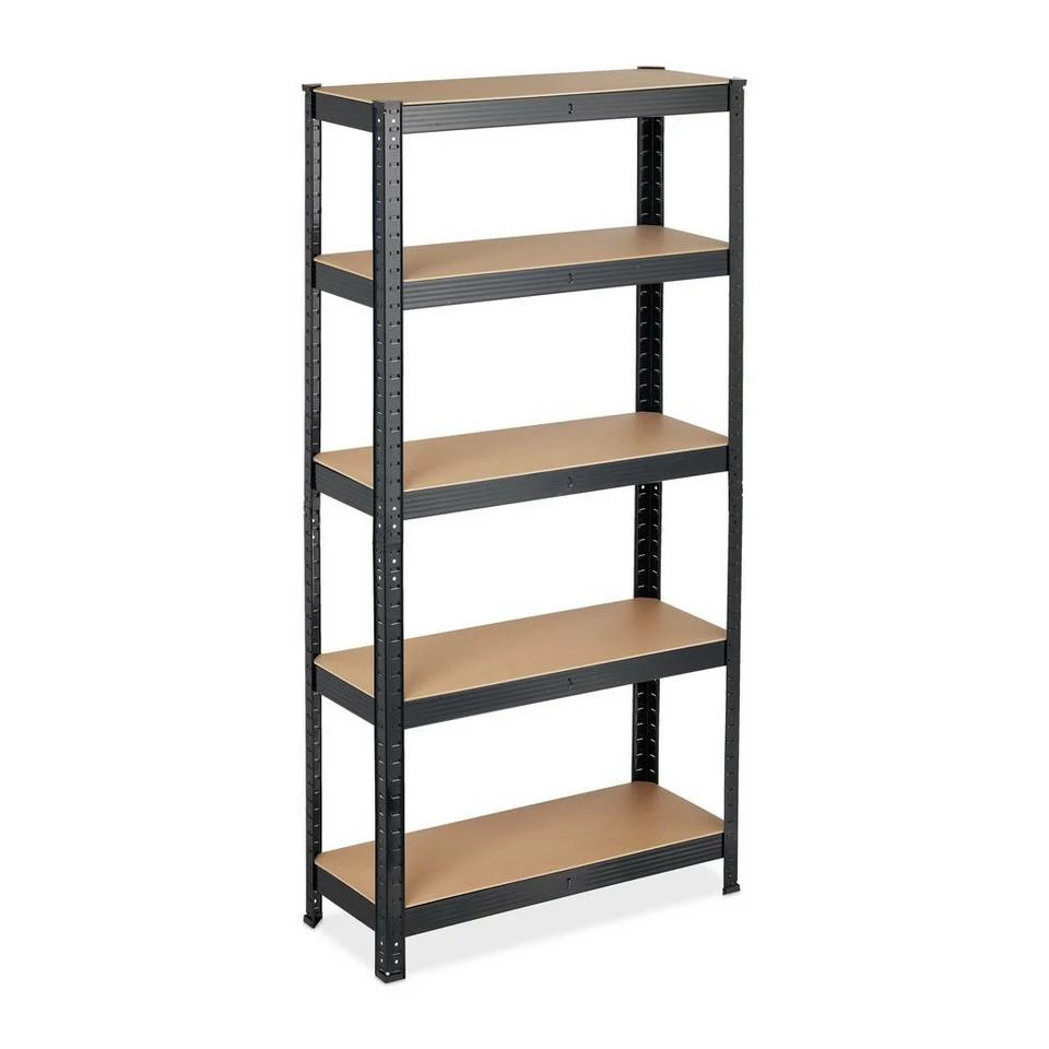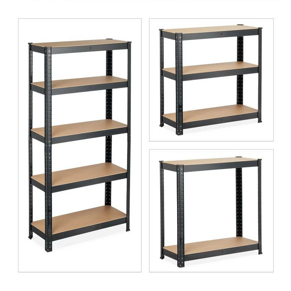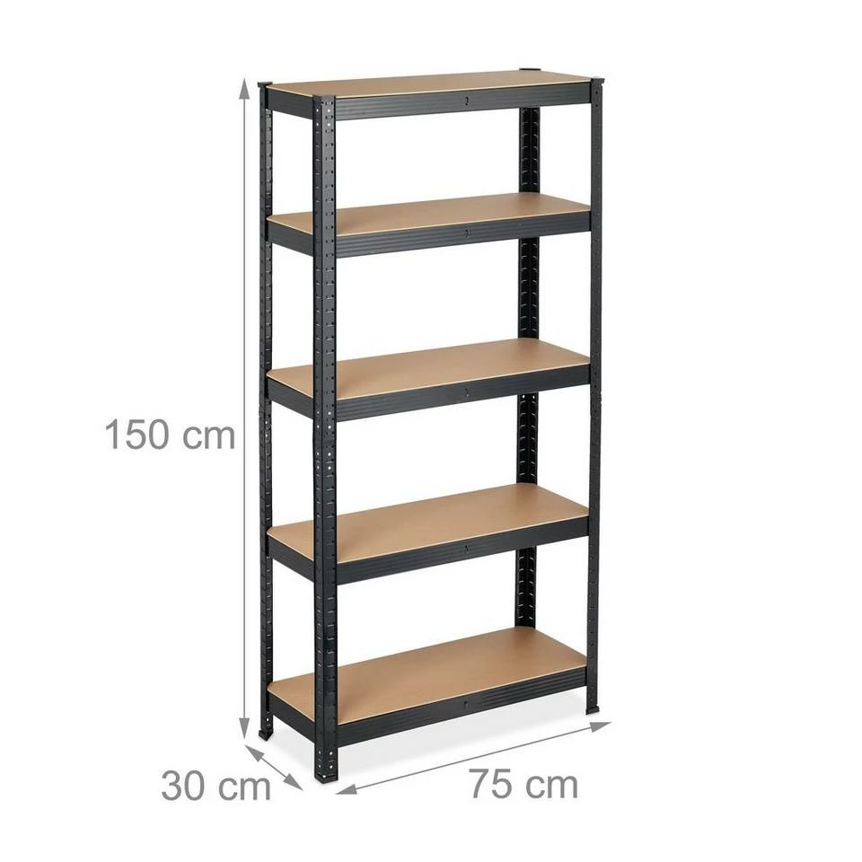 - Basics: Schwarzes Regal – Traglast gesamt: ca. 875 kg – Je Ebene: ca. 175 kg – HBT: ca. 150x75x30 cm