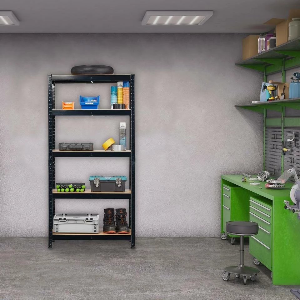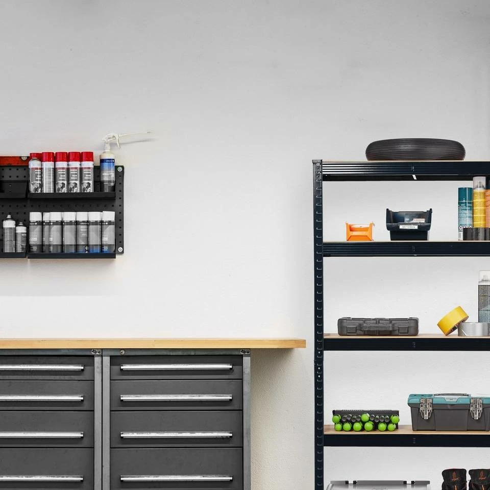 - Stauraum: Lagerregal aus Stahl und MDF für Garage, Werkstatt, Keller – Platz für Werkzeug, Getränke