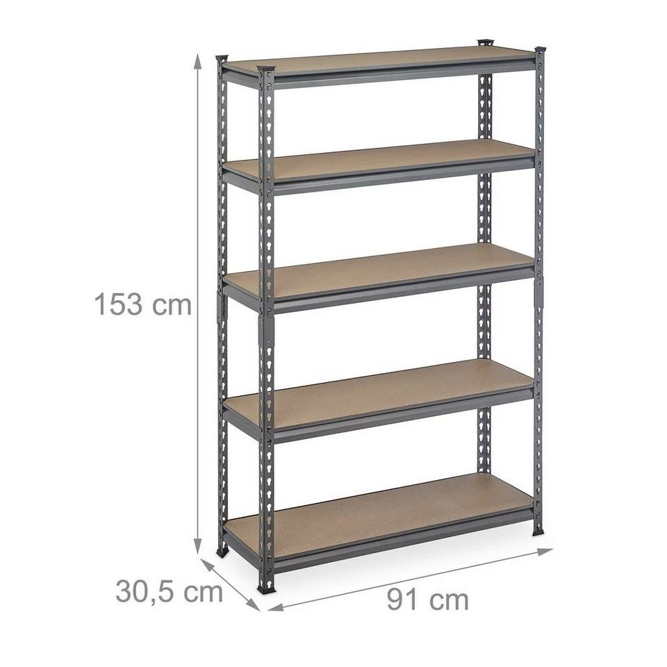 - Basics: Graues Regal – Traglast gesamt: ca. 1800 kg – Je Ebene: ca. 360 kg – HBT: ca. 158x91x30,5 cm