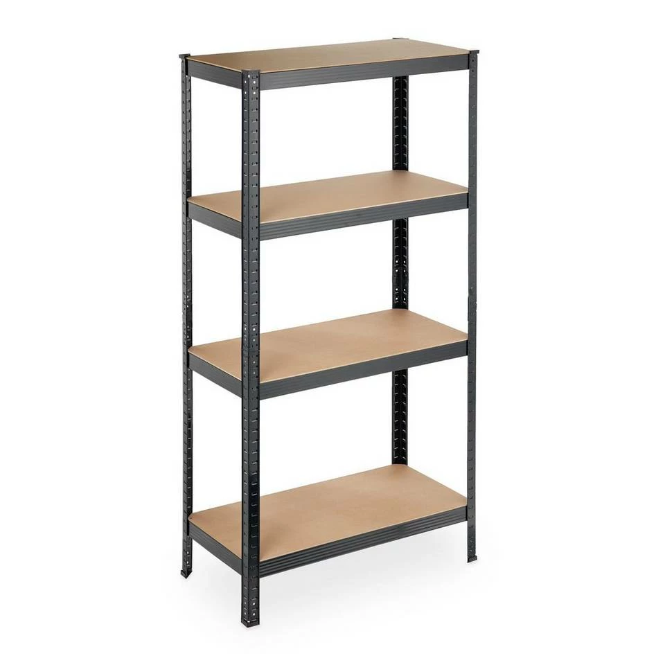 Lastenregal für Haus und Garten Das verlässliche Schwerlastregal schenkt Ihnen nützlichen Stauraum, ob zur übersichtlichen Lagerung Ihrer Gartengeräte oder zur sicheren Aufbewahrung von Haushaltshelfern. Dank seiner hohen Belastbarkeit ist das Metallregal auch für den Einsatz als Garagen- oder Werkstattregal geeignet. Die Steckverbindungen ermöglichen einen einfachen Aufbau ohne Bohren. Die 4 Regalböden aus MDF können nach Bedarf eingesetzt werden. Sie entscheiden selbst über die Höhe der Fächer. Tipp: Das praktische Stecksystem benötigt keinerlei Schrauben, daher funktioniert der Aufbau schnell und einfach. Sie benötigen einen Gummihammer. Bauen Sie das Regal mit Handschuhen auf. Unter Umständen brauchen Sie einen Schraubenzieher, um die Zinken leicht vor zu biegen.