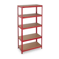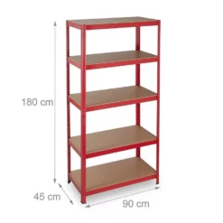 - Basics: Rotes Regal – Traglast gesamt: ca. 875 kg – Je Ebene: ca. 175 kg – HxBxT: ca. 180x90x45 cm