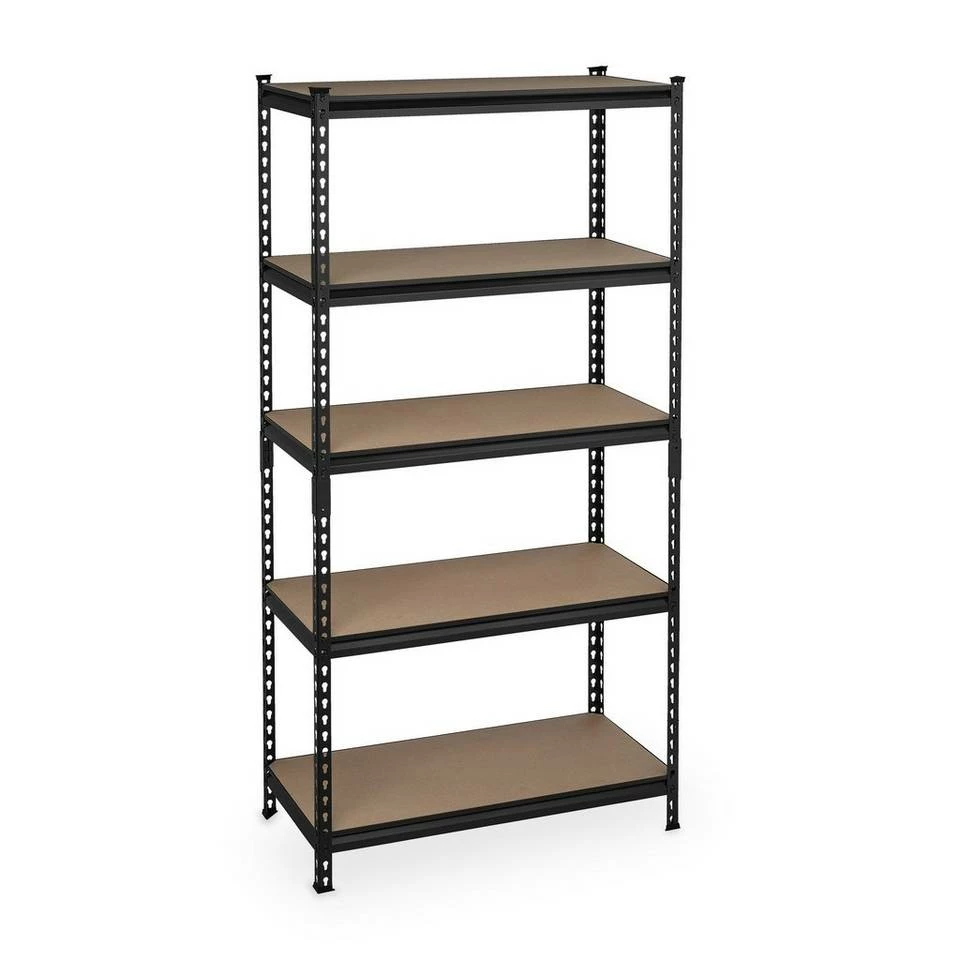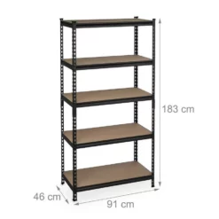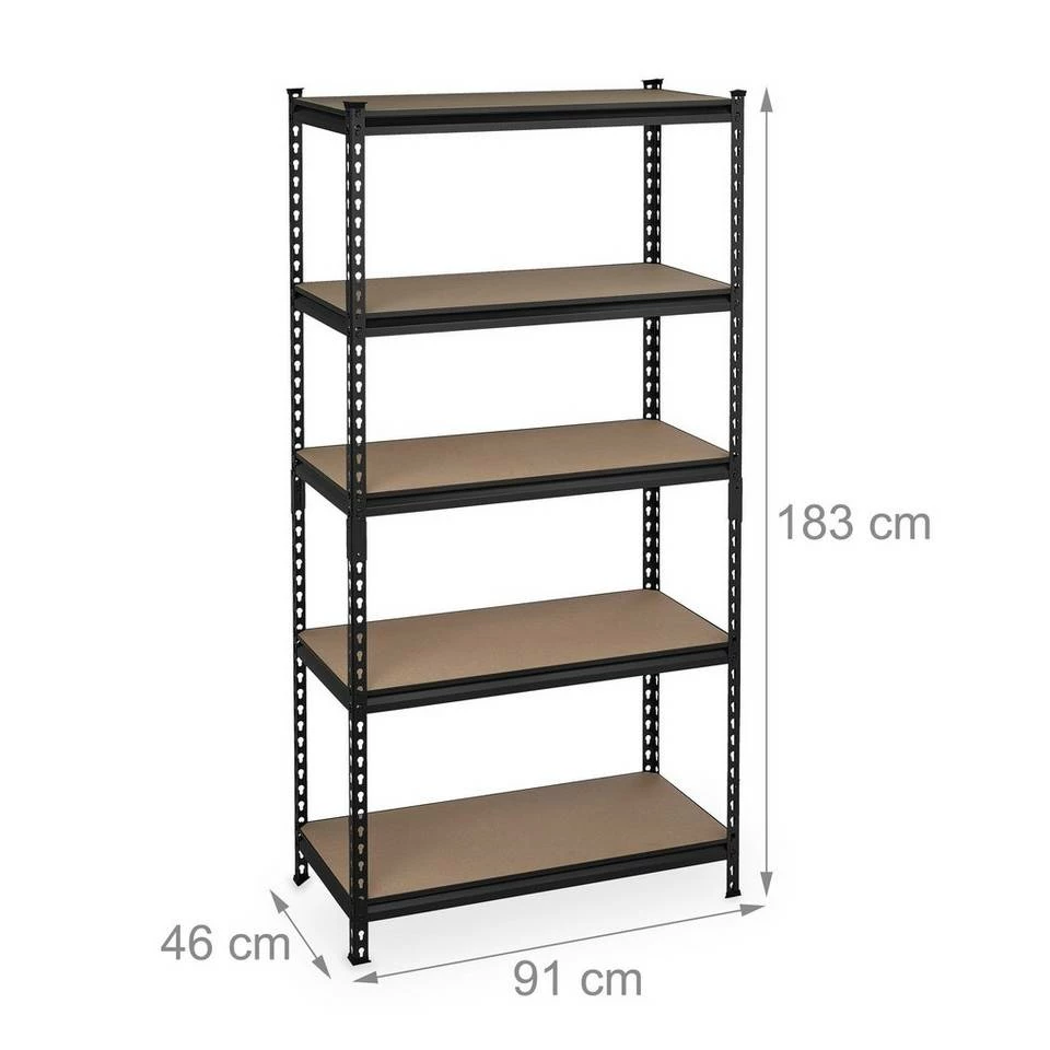 - Basics: Schwarzes Regal – Traglast gesamt: ca. 1800 kg – Je Ebene: ca. 360 kg – HBT: ca. 183x91x46 cm