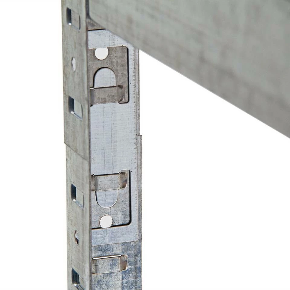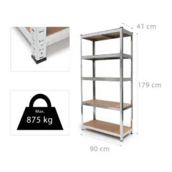 Ordnung schaffen mit dem Schwerlastregal Wohin mit Reifen, Maschinen, Werkzeug und anderem schweren Gerät? Das Schwerlastregal bietet genug Platz und Tragkraft, um in Keller, Hauswirtschaftsraum, Garage, Speisekammer oder Gartenhäuschen für Ordnung zu sorgen. Bei gleichmäßiger Lastenverteilung besitzt das Schwerlastregal eine Tragkraft von 875 kg, so können Sie auf insgesamt fünf variierbaren Böden verschiedenste Gerätschaften mit jeweils 175 kg pro Etage lagern. Besonders praktisch ist das einfache Stecksystem, daher sind keinerlei Schrauben erforderlich und der Aufbau funktioniert schnell und einfach. Das Schwerlastregal ist sehr stabil, platzsparend und standfest, sodass es zur Lagerung in keinem Zuhause mehr fehlen darf.