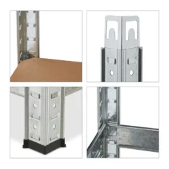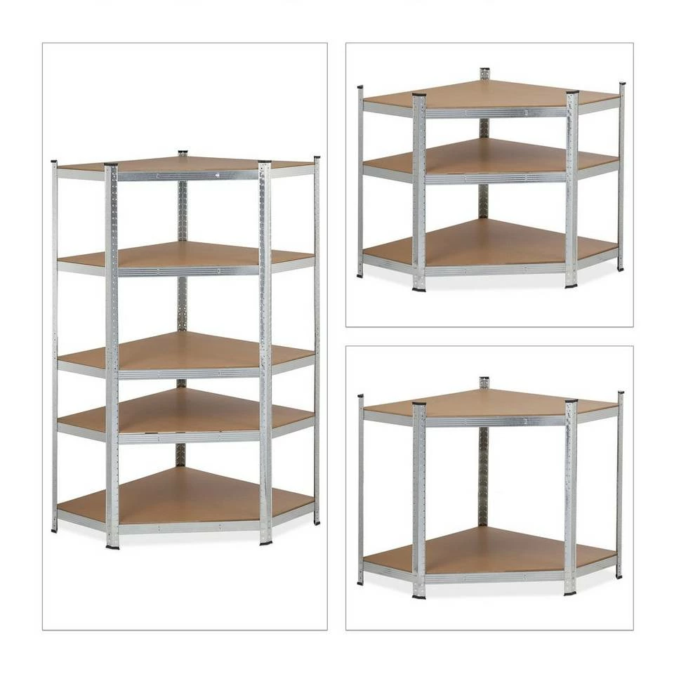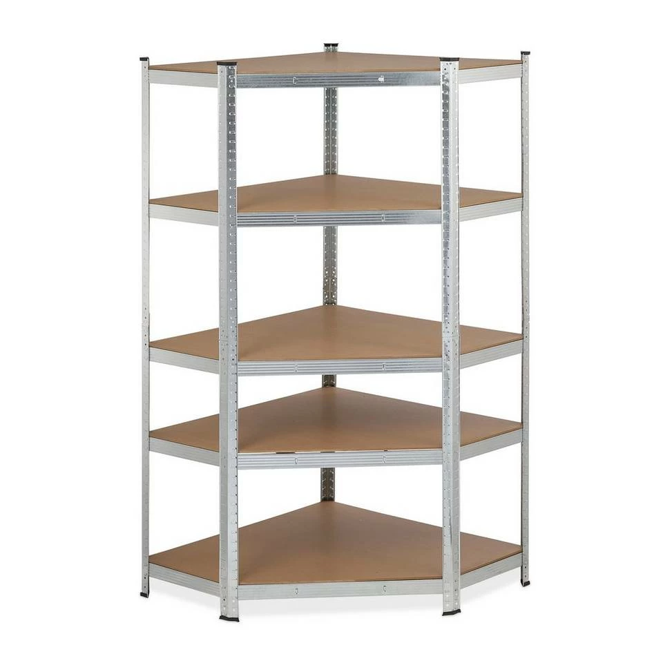 Verzinktes Eck Schwerlastregal mit 5 Böden Schaffen Sie mit diesem verzinkten Schwerlastregal Ordnung im Keller, in der Garage oder im Gartenhäuschen. Als praktisches Eckregal spart es Platz in kleineren Räumen und bietet dennoch eine Menge Staufläche für Werkzeug, Haushaltsvorräte, Ordner uvm. Die 5 MDF-Böden des stabilen Abstellraum-Regals lassen sich in unterschiedlicher Höhe justieren, sodass Sie die Fachgrößen des Metallregals Ihren Bedürfnissen anpassen können. Dank cleveren Stecksystems ist das Regal rasch zusammengebaut. Tipp: Das praktische Stecksystem benötigt keinerlei Schrauben, daher funktioniert der Aufbau schnell und einfach. Sie benötigen einen Gummihammer. Bauen Sie das Regal mit Handschuhen auf. Unter Umständen brauchen Sie einen Schraubenzieher, um die Zinken leicht vor zu biegen.