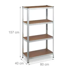 - Basics: Verzinktes Regal – Traglast gesamt: ca. 280 kg – Je Ebene: ca. 70 kg – HBT: ca. 157x80x40 cm