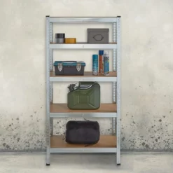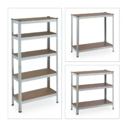 - Basics: Verzinktes Regal – Traglast gesamt: ca. 875kg – Je Ebene: ca. 175 kg – HBT: ca. 150x75x30 cm