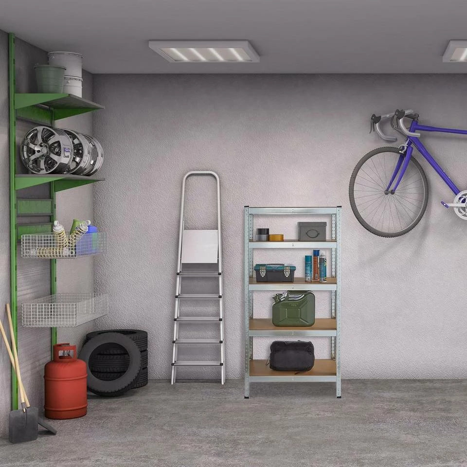- Stauraum: Lagerregal aus Stahl und MDF für Garage, Werkstatt, Keller – Platz für Werkzeug, Getränke