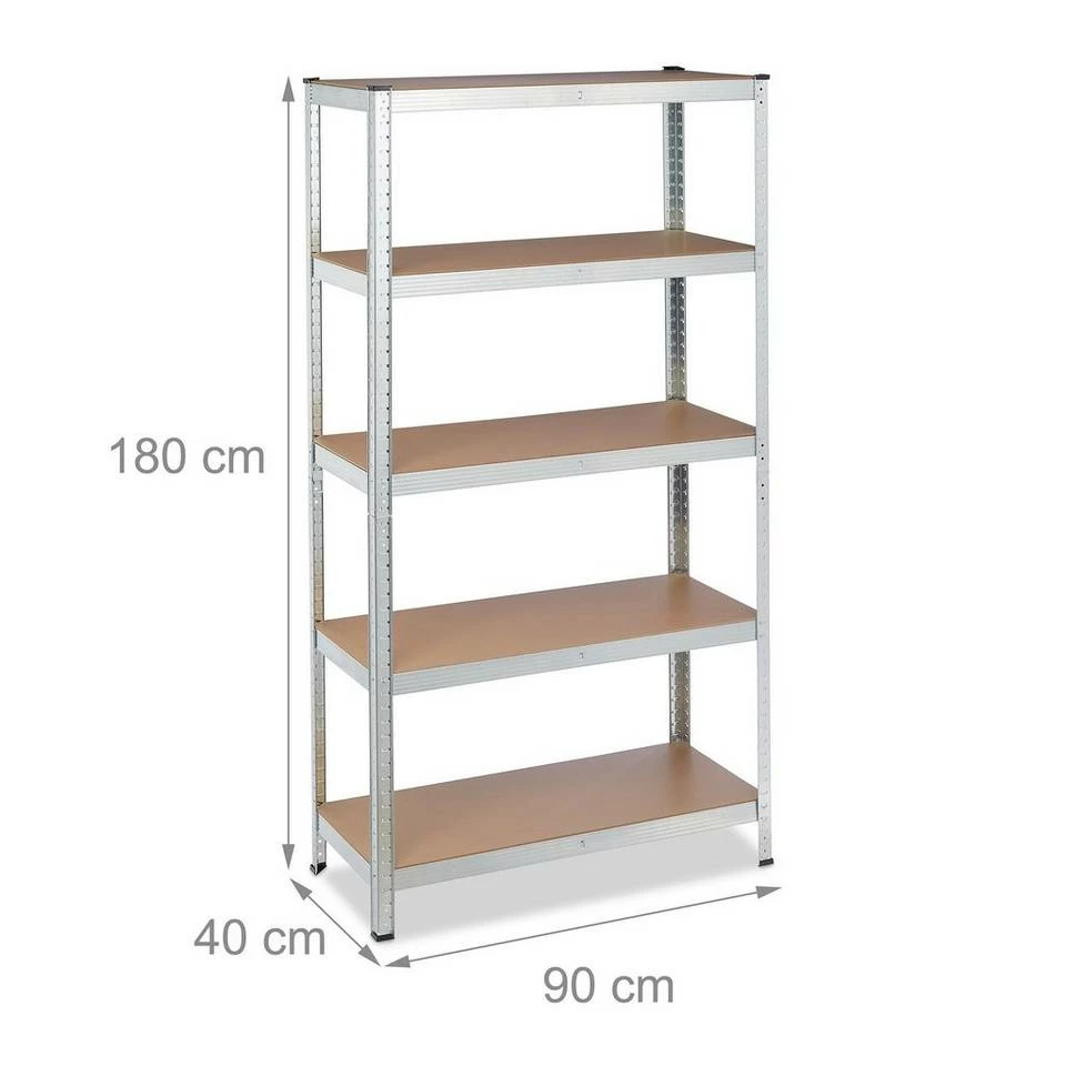 - Basics: Verzinktes Regal – Traglast gesamt: ca. 875kg – Je Ebene: ca. 175 kg – HBT: ca. 180x90x40 cm