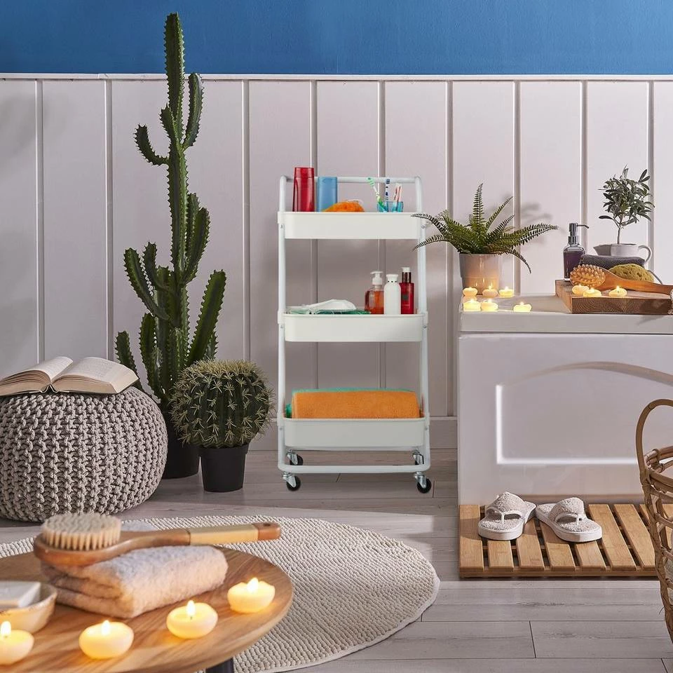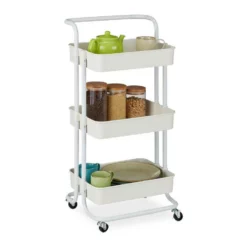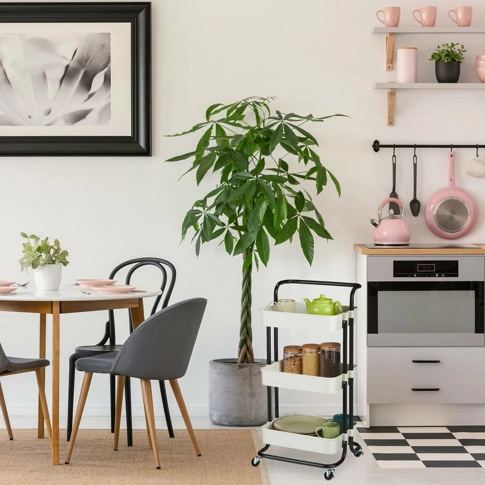 Vielseitiger Haushaltswagen für Küche, Bad oder Büro Der moderne Allzweckwagen mit 3 Etagen ist ein praktischer Helfer für Ihr Zuhause. Ob als Vorratswagen in der Küche, als Servierwagen für Speisen und Geschirr, als Kosmetikwagen im Bad oder als Aufbewahrungswagen im Büro – der Etagenwagen kann in den verschiedensten Räumen zum Einsatz kommen. Dank der 4 beweglichen Rollen und des handlichen Griffs lässt sich der Küchenwagen jederzeit leicht verschieben. 2 Feststellbremsen sorgen am Wunschort für einen sicheren Stand.