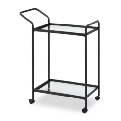 - Stilvoll: Schlichtes Metallgestell in Schwarz und Ablagen aus 5mm Glas – Barwagen im Industrial Look