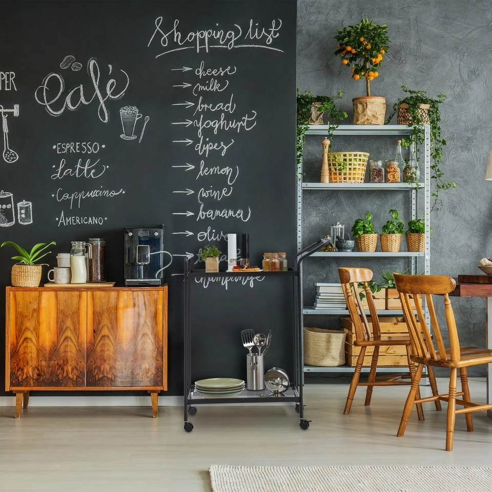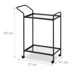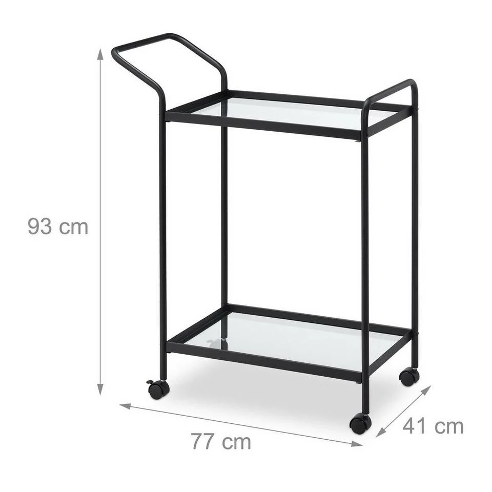 Servierwagen mit 2 Ebenen Ob beim Frühstück, Brunch oder bei der nächsten Geburtstagsparty, dieser Küchenrollwagen mit zwei großen Ebenen transportiert Getränke, Köstlichkeiten und Geschirr. Die um 360° drehbaren Rollen und der angenehm erhöhte Griff sorgen dabei für Flexibilität und Transportkomfort. Zwei Feststellbremsen helfen Dir, den Küchenwagen sicher und stabil abzustellen. Mit seinem minimalistischen Design aus matt-schwarzem Metall und Glasböden ist der Allzweckwagen eine schöne Ergänzung für Küche, Wohn- oder Esszimmer.