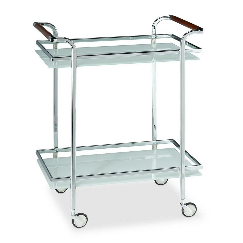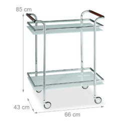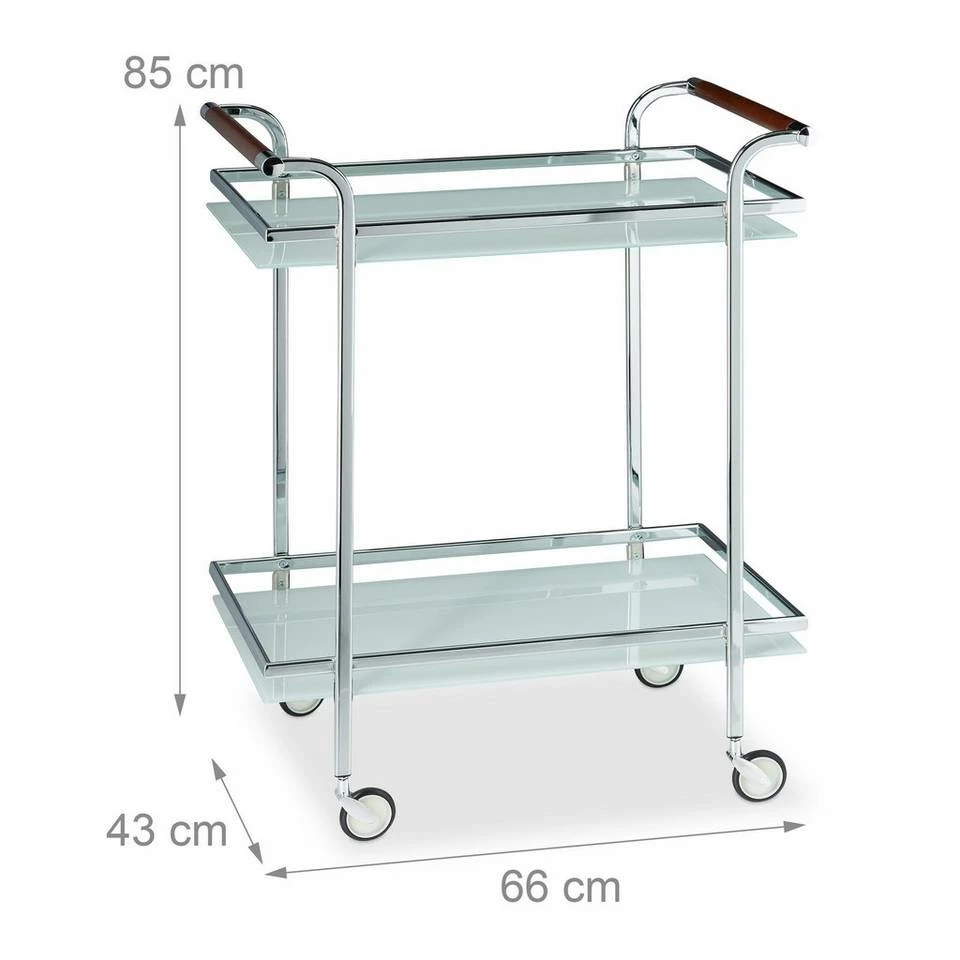 Servicewagen in elegantem Design Der Servierwagen Milchglas bietet Ihnen die besondere Weise, Speisen und Getränke zu servieren. Sein edler Stil ist durch gehärtete Glasplatten und ein Chromgestell charakterisiert. Die 2 großen Ablageflächen des Teewagens sind praktisch. Sie sind seitlich mit Streben versehen, welche das Umkippen höherer Objekte verhindern. 2 seitliche Griffe in schönem Braun und die Deluxe Rollen sorgen für ein geschmeidiges Fahren des Küchenwagens.