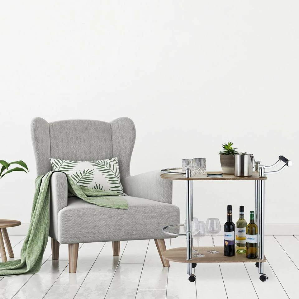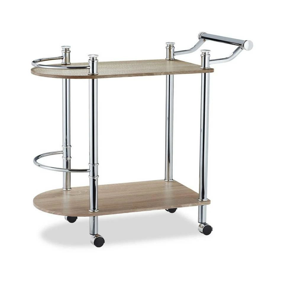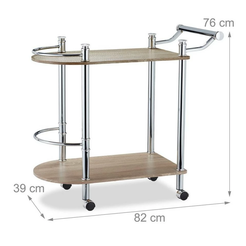 Mobiles Catering mit dem Servierwagen Der Barwagen ist eine elegante Möglichkeit, zu besonderen Anlässen Getränke und Speisen zu servieren. Er überzeugt in modernem Design mit MDF-Platten in Sonoma Eicheoptik, die von einem verchromten Stahlgestell getragen werden. Der Teewagen verfügt über 2 große Ablagen auf unterschiedlichen Ebenen. An den Vorderseiten sind Halterungen angebracht, die das Umfallen höherer Objekte verhindern sollen. Der praktische Griff und die 4 Rollen ermöglichen ein angenehmes Fahren des Servierwagens.