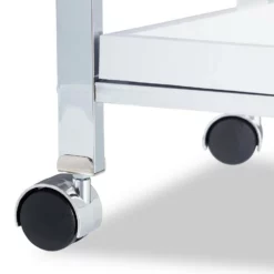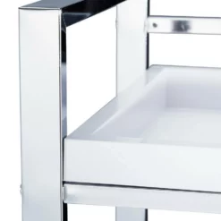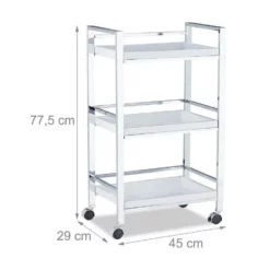 Vielseitiger Haushaltswagen auf Rollen Nutzen Sie den modernen Teewagen mit 3 Ebenen als Ablage oder Transportmittel von Bad- sowie Küchenutensilien. Die abnehmbaren Tabletts sind dabei besonders praktisch. Bringen Sie beispielsweise Geschirr und Besteck zu Ihrem Esstisch oder verwenden Sie die Tabletts zum Abräumen von Speisen und Getränken. Dank seiner schmalen Form ist der Servierwagen platzsparend und kann schnell verstaut werden. Zusätzlich überzeugt er mit seinem schlichten Stil von weißen Ablagen in einem verchromten Gestell.