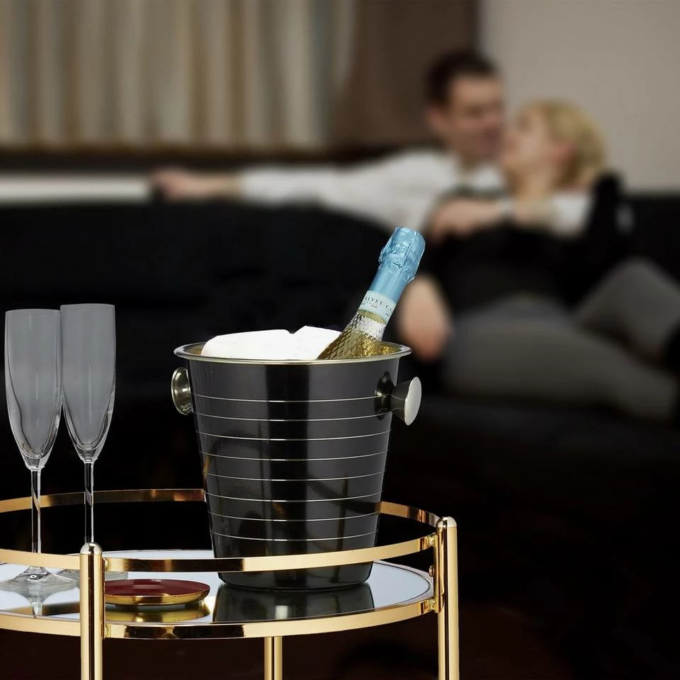 Goldener Barwagen mit 2 Ebenen Beeindrucken Sie Ihre Gäste auf der nächsten Party in Ihren 4 Wänden mit diesem eleganten Beistellwagen. Servieren Sie schön angerichtete Snacks im Esszimmer, während die ersten Gäste dank Ihres Services leckere Getränke im Wohnzimmer genießen können. Die obere Ablage ermöglicht dank des Randes sicheren Transport, während die Kugelrollen für besten Fahrkomfort sorgen. Dabei überzeugt der Rollwagen besonders durch sein luxuriöses Design mit einem glänzendem Gestell in Gold-Optik & verspiegelten Ablagen.