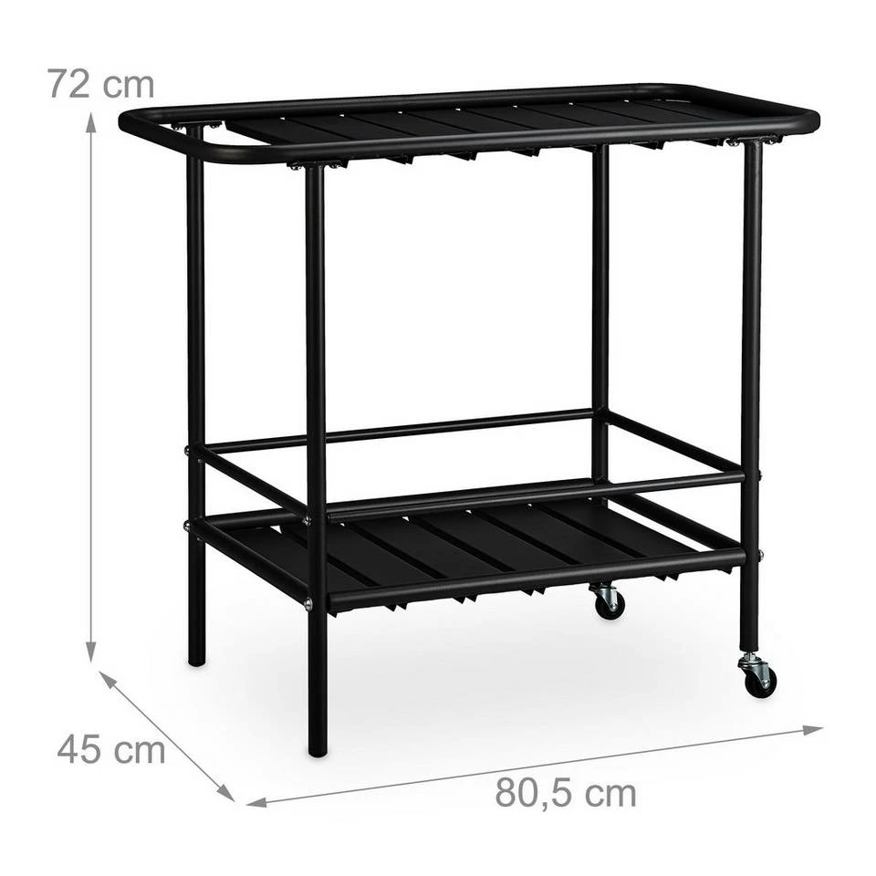Outdoor Beistellwagen mit 2 Ablagefächern Egal ob Sie leckere Gerichte oder kühle, erfrischende Getränke Ihren Gästen servieren möchten – dieser moderne Rollwagen in Schwarz hilft Ihnen dabei. Durch die erhöhten Ränder lassen sich im unteren Fach bequem und sicher Glasfaschen oder Geschirr transportieren. Die obere Ablage des Küchenwagens ist perfekt, um Kuchen oder das Mittagessen auf die Terrasse zu befördern. Die 360° drehbaren Rollen sorgen zusammen mit dem handlichen Griff für ein flexibles Handling des Servierwagens.