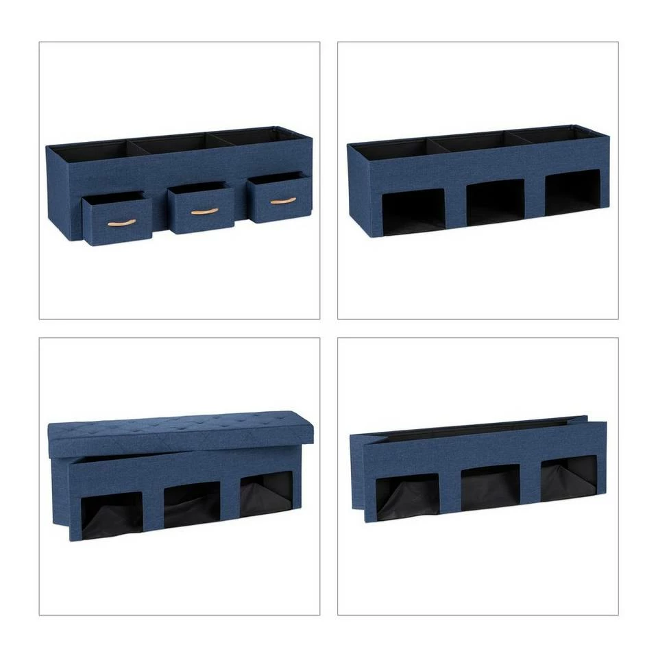 Sitztruhe mit Stauraum Mit dieser gepolsterten Truhe bekommen Sie nicht nur eine bequeme Sitzmöglichkeit, sie bietet zusätzlich auch cleveren Stauraum. In den insgesamt 3 Fächern und 3 Schubladen verstauen Sie beispielsweise Kleidung, Spielzeug oder Bücher ordentlich und blickgeschützt. Durch die Falttechnik ist die Truhe schnell aufgebaut und bei Nichtbedarf auch ebenso einfach wieder zusammengeklappt. Ob zum Verweilen oder kurz zum Schuhe binden, die Dielenbank bietet Platz und Komfort zum Sitzen.