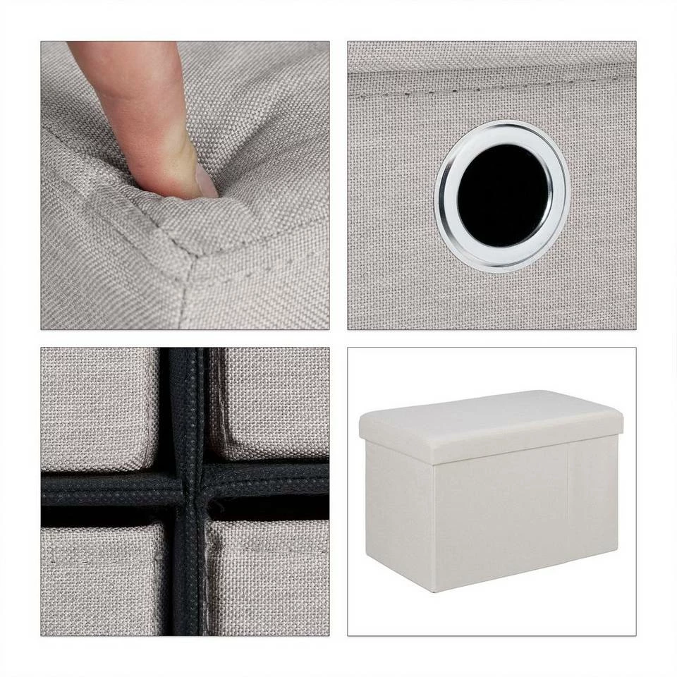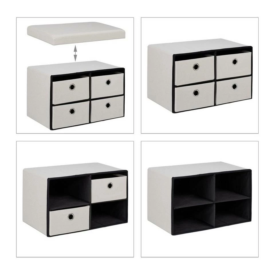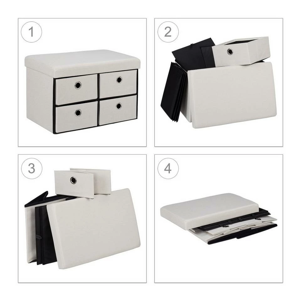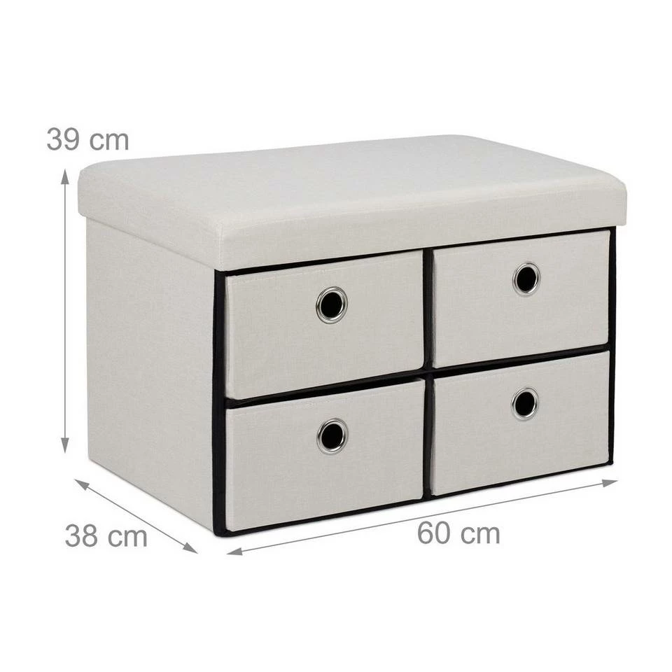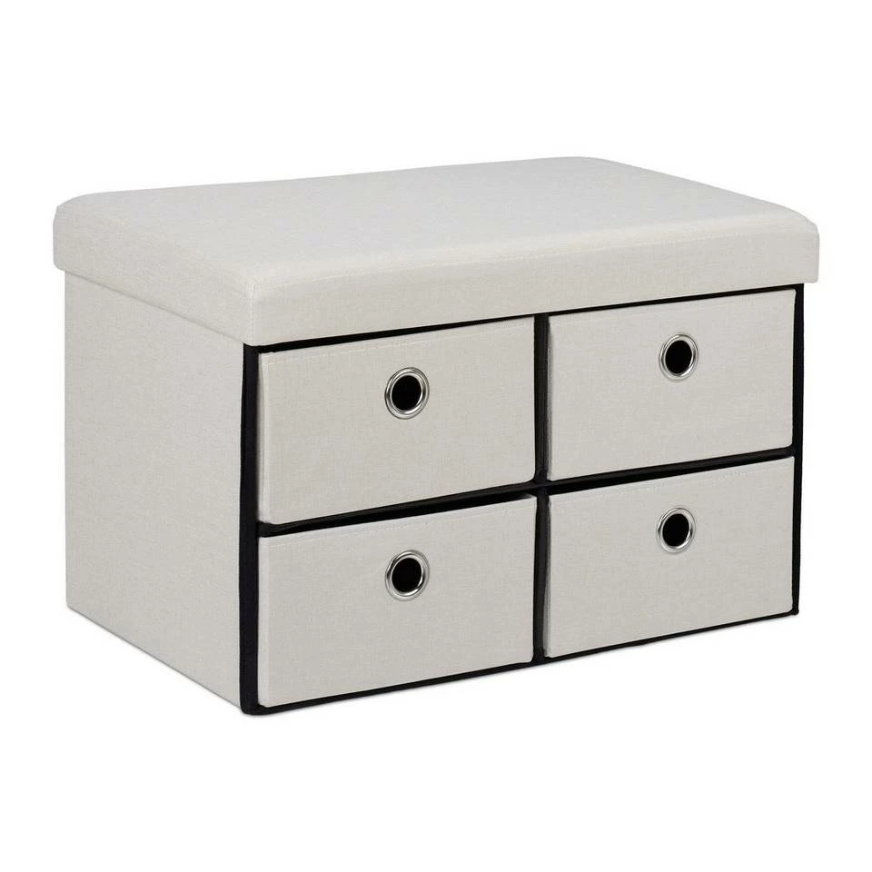 Cremefarbene Flurbank in Leinen Optik Diese Faltbank vereint Aufbewahrungsmöglichkeit und Sitzgelegenheit in einem und ist ein wahres Multitalent für Wohn- und Schlafzimmer, Flur oder Ankleidezimmer. Mit ihren 4 Schubfächern bietet die Stofftruhe praktischen Stauraum für Kleidungsstücke wie Schals, Mützen und Handschuhe, aber auch Spielzeug kann darin wunderbar untergebracht werden. Durch den gepolsterten Deckel lässt es sich auf der Banktruhe bequem sitzen. Bei Nichtgebrauch ist die Bettbank schnell zusammengefaltet und verstaut.