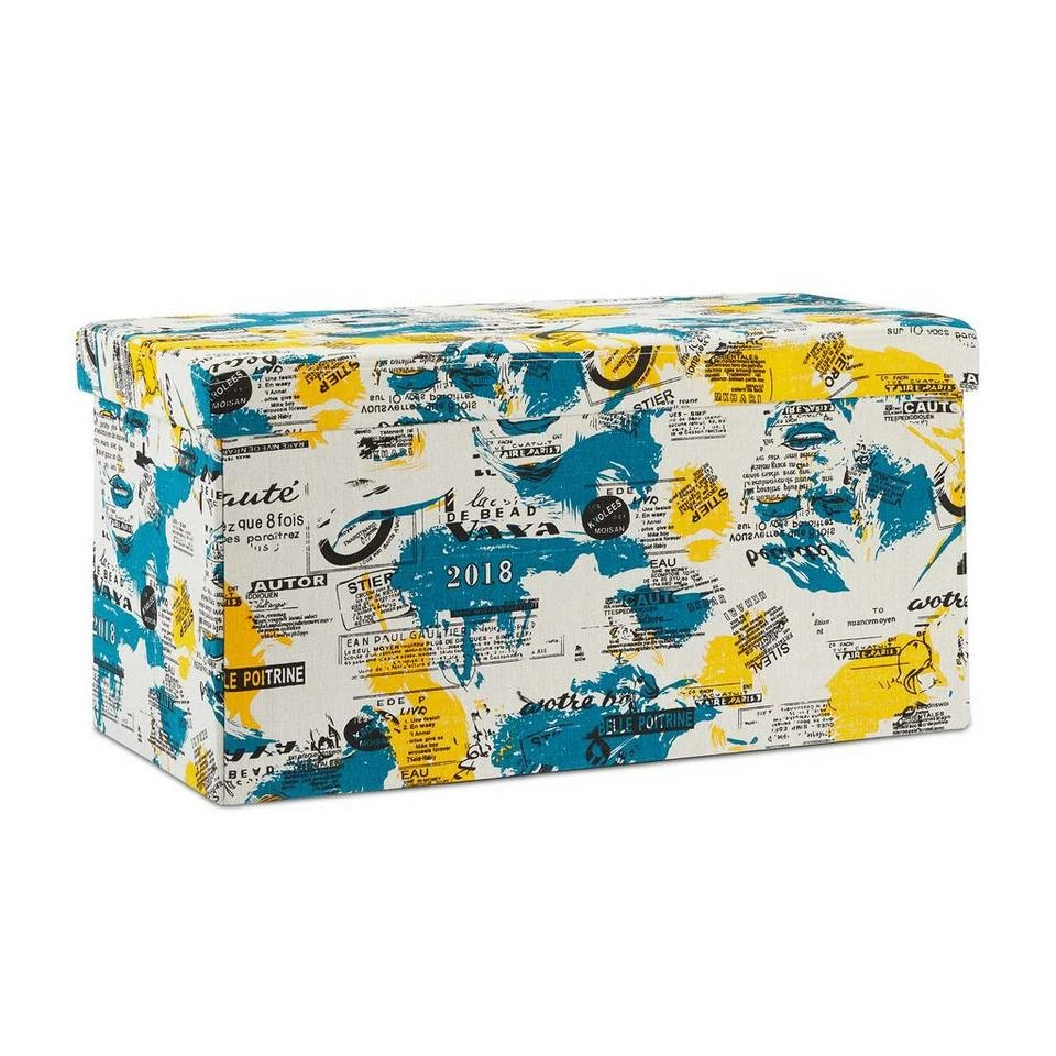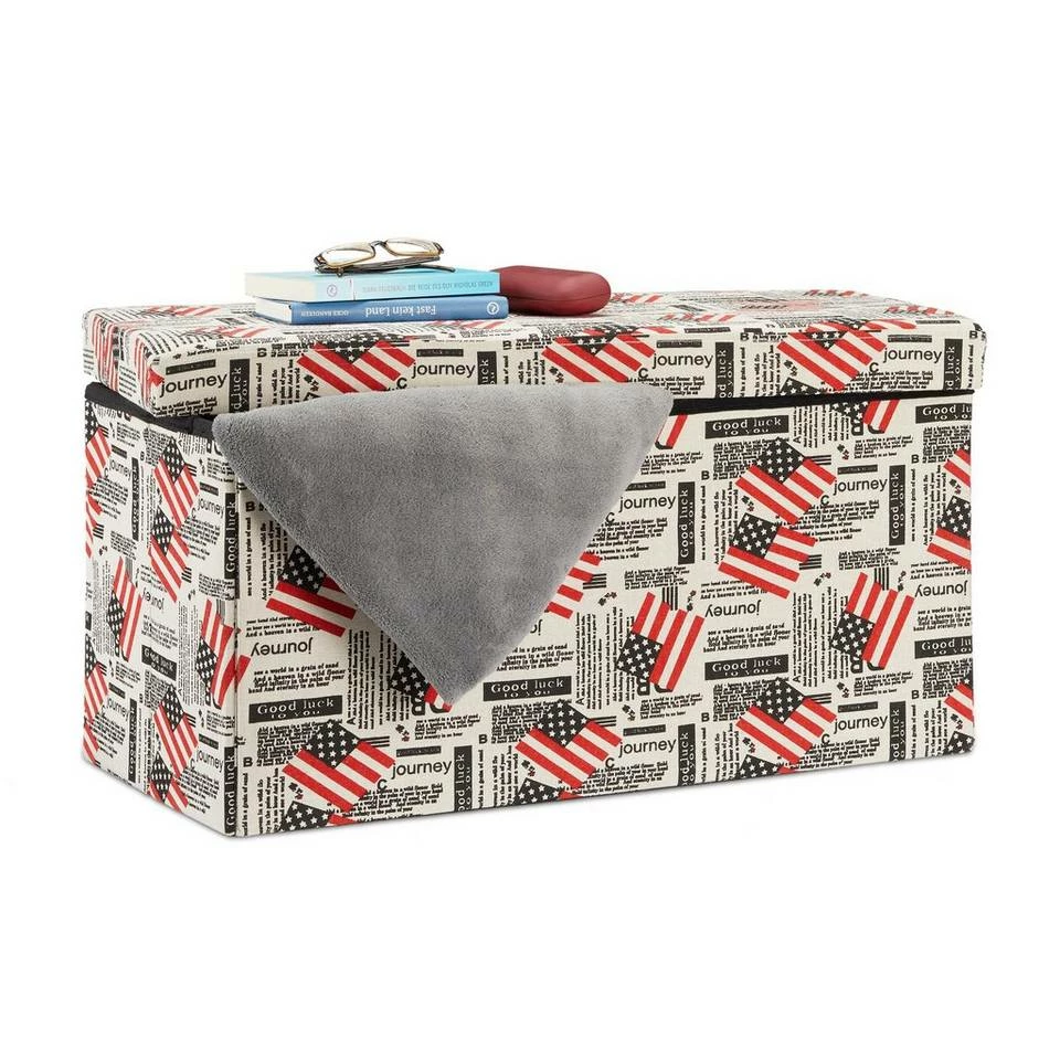 Faltbare Sitzbank in originellem Design Ein Hingucker in Flur, Schlafzimmer oder Wohnzimmer ist die faltbare Sitzbank aus weichem Leinen. Der hellgraue Stoff gibt der Sitztruhe ein rustikales Flair. Diverse Aufdrucke von US-Flagge bis Kaffeekultur geben der Polsterbank einen nostalgischen Charme. Das atmungsaktive Leinen aus Baumwolle ist hautfreundlich und pflegeleicht. Neben einem ansprechenden Design und hohem Sitzkomfort bietet die Sitzgelegenheit auch praktischen Stauraum. Nutzen Sie die Aufbewahrungstruhe als Kiste für Bettwäsche, Spielzeug oder Unterlagen.