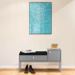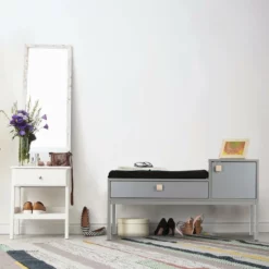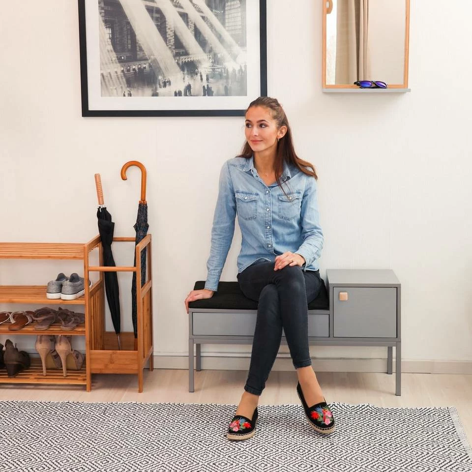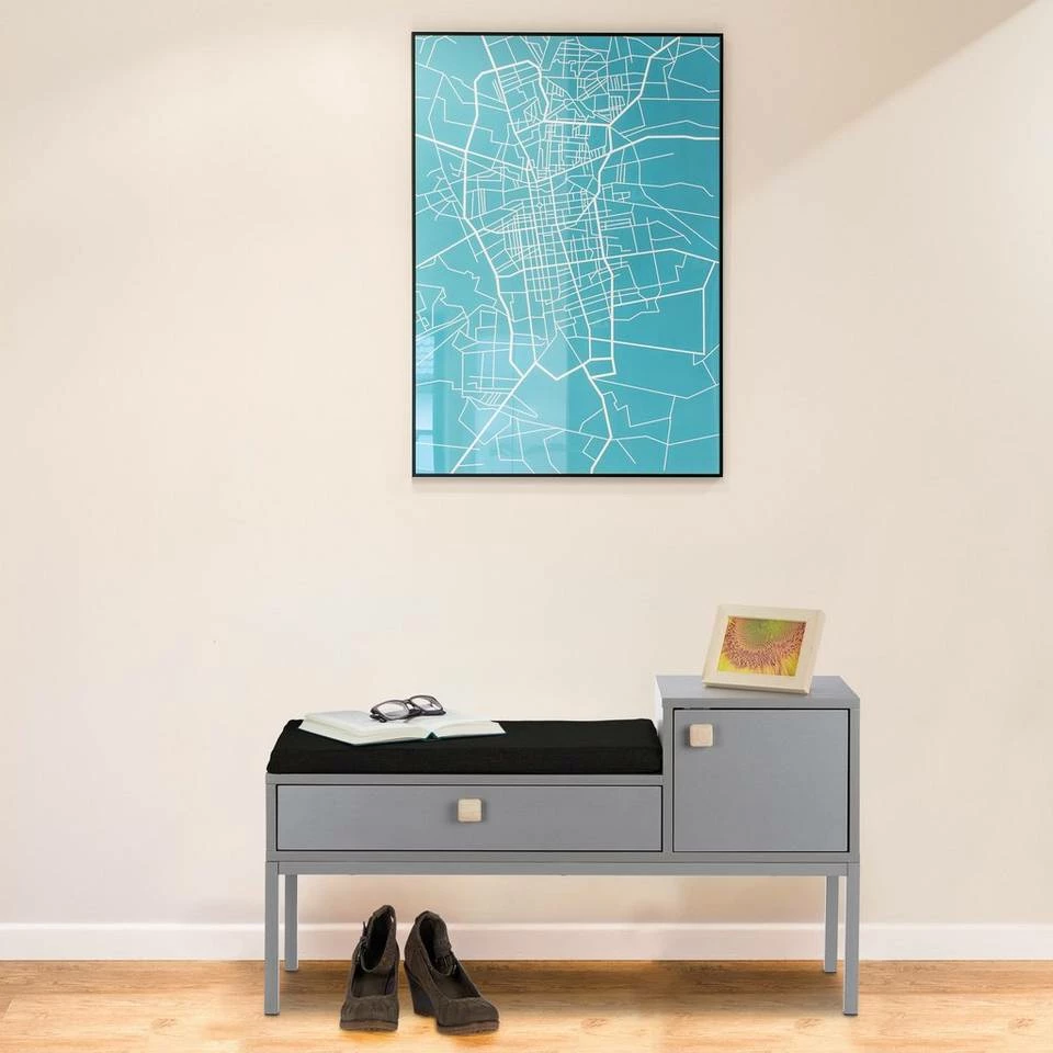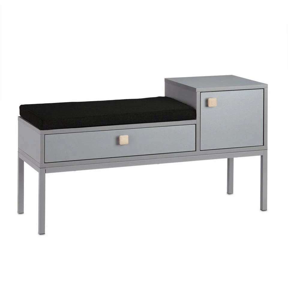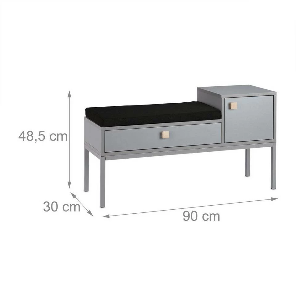 Sitzkommode für den Flur Sich im Flur auf die Schnelle die Schuhe an- oder auszuziehen wird dank der vielseitigen Schuhbank zum reinsten Vergnügen. Anstatt sich im Stehen zu quälen, nehmen Sie einfach auf der bequemen Sitzpolsterung Platz. Sie ist lose und hat einen praktischen Reißverschluss. An zusätzlichen Stauraum für kleinere Gegenstände ist ebenso gedacht. Die Schublade läuft leise und die Tür schließt magnetisch. Die Bodenschoner verhindern, dass sich die Flurbank in Form unschöner Kratzer im Untergrund verewigt.