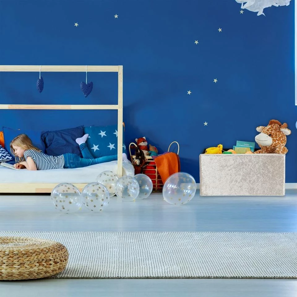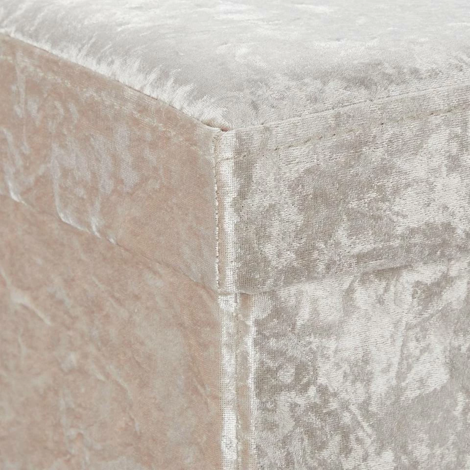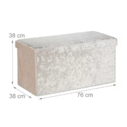 Beigefarbene Bettbank aus Samt Die Sitztruhe ist ebenso praktisch wie dekorativ. Im Innern findet sich ausreichend Stauraum für Bettwäsche, Zeitschriften, Spielzeug, Kissen und vieles mehr. Die samtige Oberfläche macht aus der Sitzbank ein edles Möbelstück für Flur, Wohn- oder Schlafzimmer. Aber nicht nur zur Aufbewahrung, auch als komfortable Sitzmöglichkeit ist die gepolsterte Truhenbank geeignet. Sollten Sie die Bank einmal nicht benötigen, ist diese im Nu platzsparend zusammengefaltet.