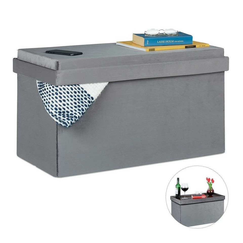 Banktruhe mit integriertem Tablett Die Truhenbank ist ein echter funktionaler Allrounder. Im Inneren verschwinden Decken, Kissen, Bettbezüge oder herumfliegende Zeitschriften aus dem Blickfeld. Der gepolsterte Deckel ermöglicht ein gemütliches Sitzen im Wohn- & Schlafzimmer oder im Flur. Drehen Sie den Deckel um, bekommen Sie ein praktisches Tablett in dekorativer Holzoptik als Ablagefläche. Auf diesem können Sie beispielsweise Getränke und Knabberzeug abstellen und so ohne aufstehen zu müssen abends auf dem Sofa entspannen.