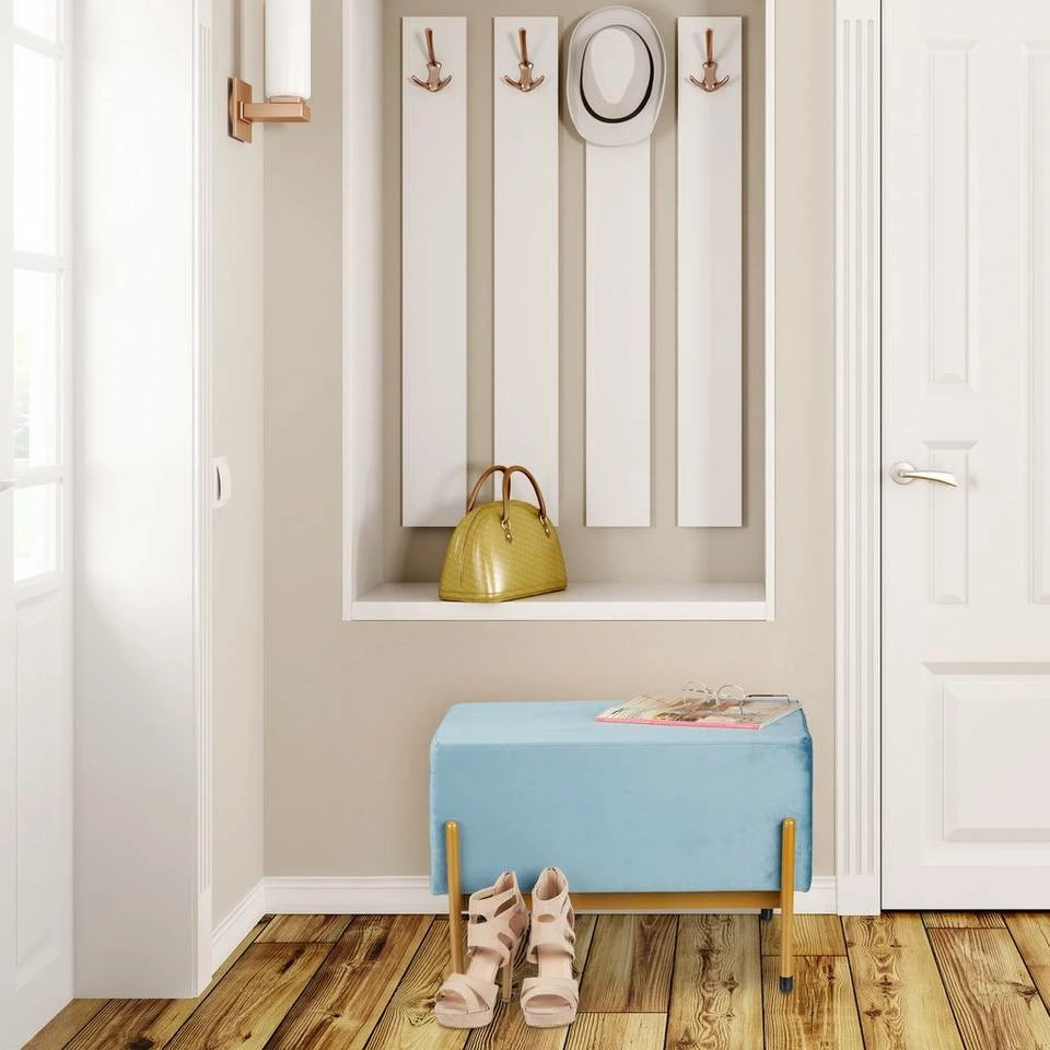 Samtbank für Wohn- und Schlafbereich Diese elegante Polstersitzbank mit hellblauem Samt-Bezug ist ein stylisches Schmuckstück für Deine vier Wände. Ob als Dielenbank im Eingangsbereich, Sofabank im Wohnzimmer oder Bettbank im Schlafzimmer – die Designbank ergänzt jeden Raum mit einem Hauch von Eleganz und Glamour. Die Flurbank ist dank gepolsterter Sitzfläche nicht nur eine bequeme Sitzgelegenheit, sondern kann auch als kleine Ablage zum Einsatz kommen. Mit ihren 4 Metallbeinen in edlem Gold steht die Schlafzimmerbank stabil.