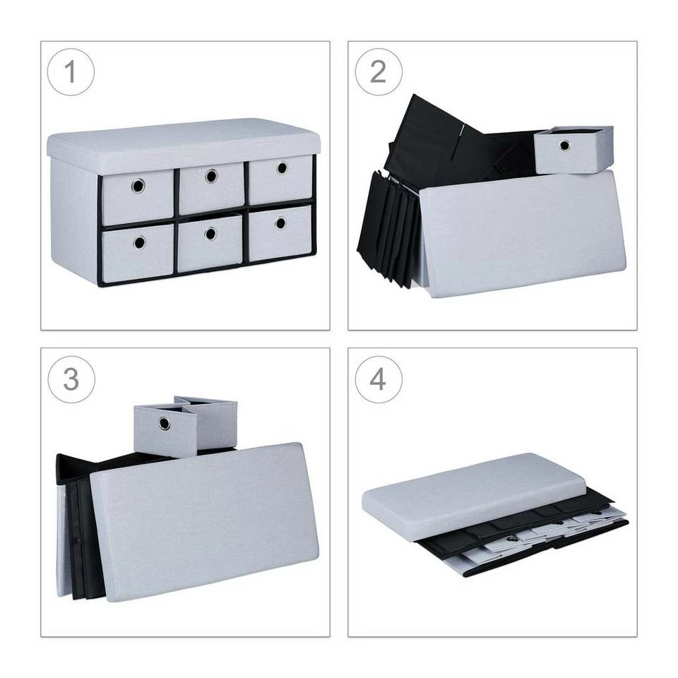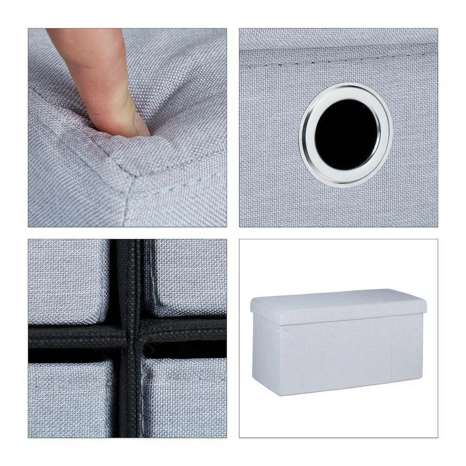 Aufbewahrungstruhe mit Sitzgelegenheit Gerade in kleinen Wohnungen beweist sich diese Sitzbank als besonders praktisch. Denn sie ist nicht nur eine normale Sitzgelegenheit, die sich als Flurbank, Bettbank oder Sitzbox im Wohnzimmer nutzen lässt. Sie beherbergt zusätzlich 6 Fächer in denen Sie verschiedenste Habseligkeiten verstauen können. Die Schubladen sind leicht zugänglich und bieten viel Platz für Bettwäsche, Decken und andere Textilien. Die Leinenoptik ist zudem noch pflegeleicht und hübsch.
