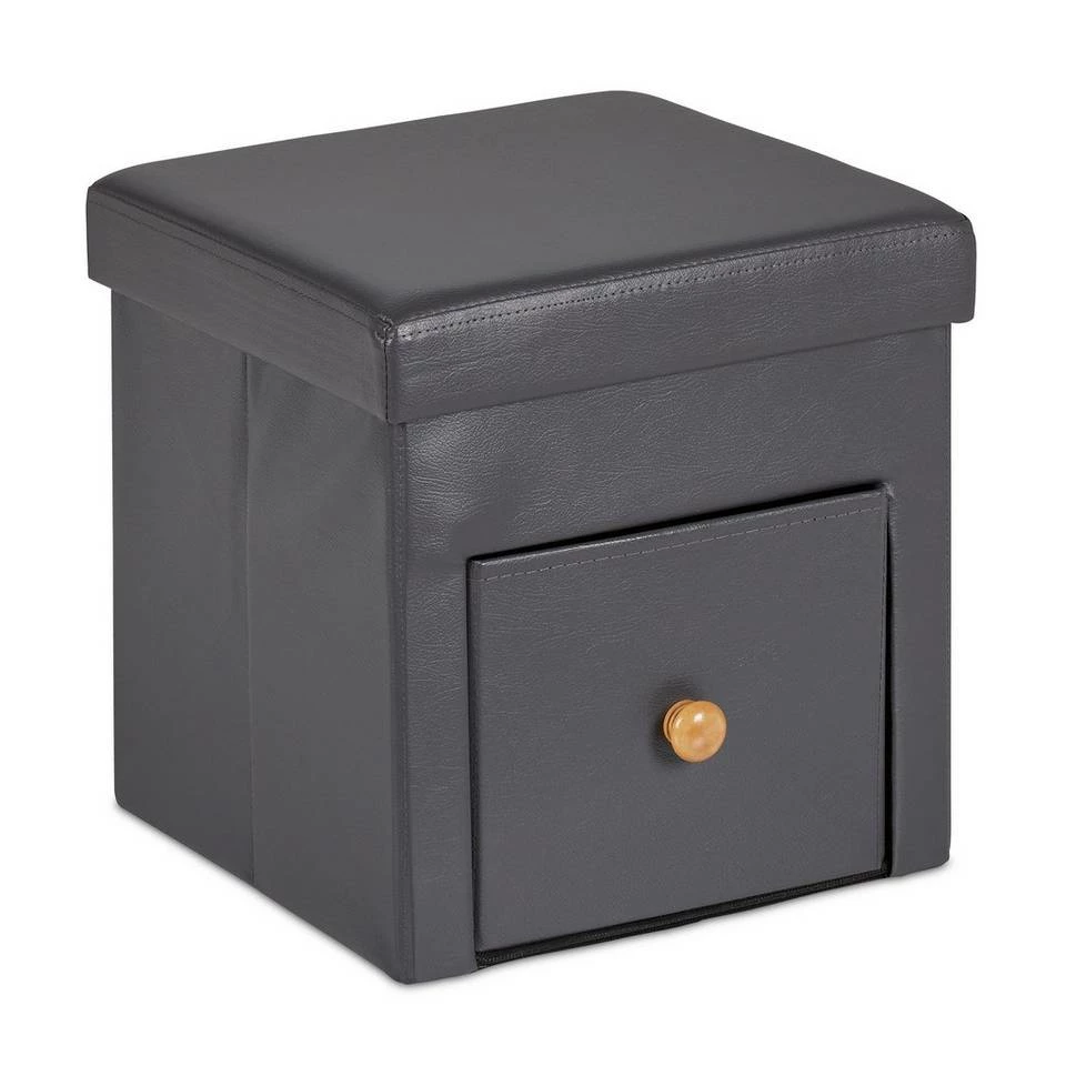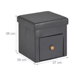 Moderner Fußhocker mit Schublade Dieser Sitzblock ist ein wahres Multitalent für den Wohnbereich. Der graue Würfelhocker in Lederoptik fügt sich bestens in moderne Einrichtungen. Doch nicht nur optisch macht der Hocker einiges her. Nutzen Sie ihn als gemütlich gepolsterten Sitzhocker ebenso wie als Fußablage vor der Couch. In der Schublade können währenddessen Zeitschriften, Brillenetui oder auch Schals, Gürtel und andere Accessoires griffbereit und blickdicht verstaut werden. Wird der Couchhocker gerade nicht verwendet, können Sie ihn zusammengefaltet verstauen.