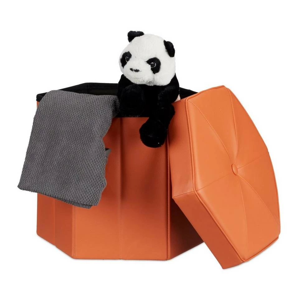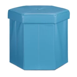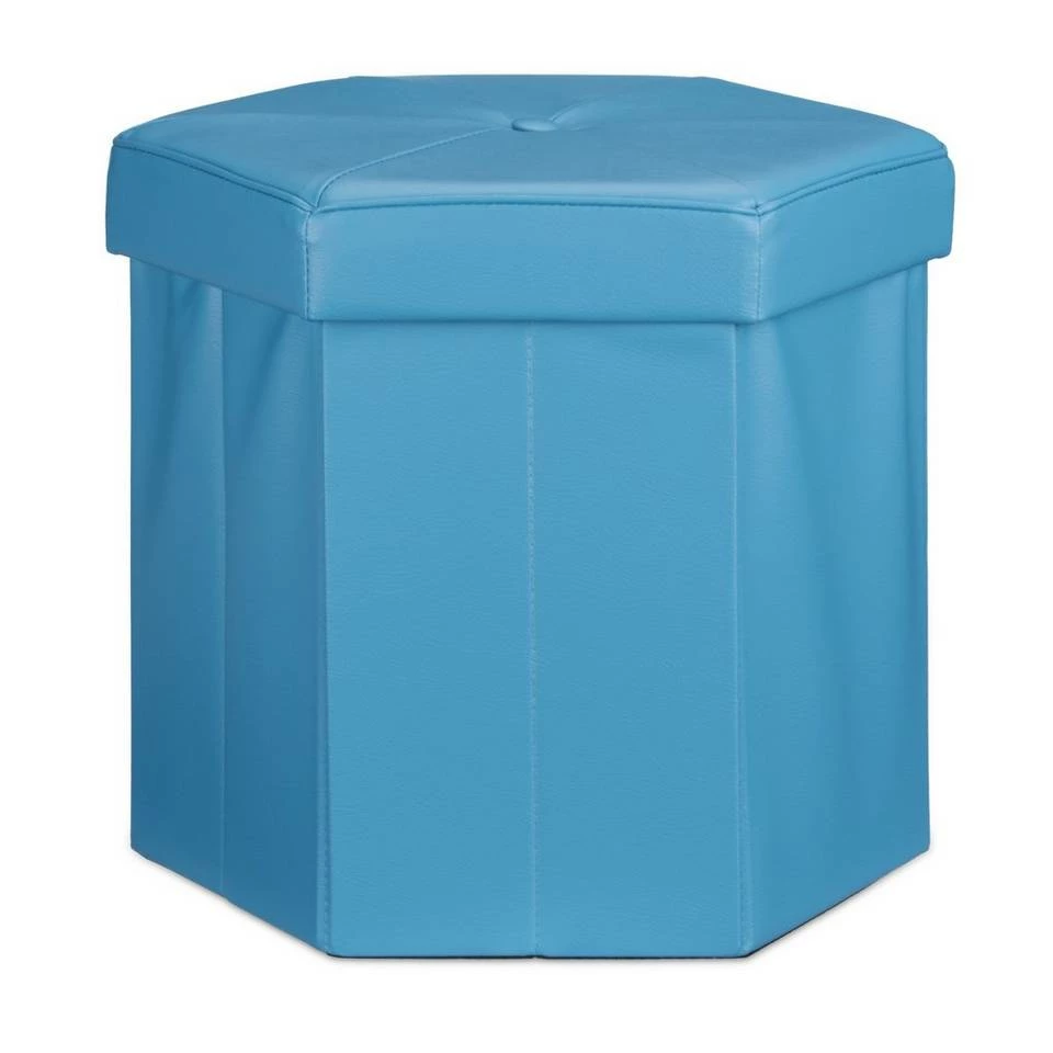 Faltbarer Sitzhocker sechseckiger Kunstleder Der sechseckige Sitzhocker ist perfekt, um Sitzmöglichkeiten und Stauraum intelligent miteinander zu verbinden. Mit 40 L Innenraum sind Bücher und Kleinkram und vieles mehr schnell untergebracht. Das verwendete Kunstleder des Sitzhockers ist hochwertig und stellt einen Hingucker dar. Die Polsterung ist angenehm und so auch für längeres Sitzen geeignet. Der Hocker kann platzsparend verstaut werden und steht in verschiedenen Farbvarianten zur Verfügung.
