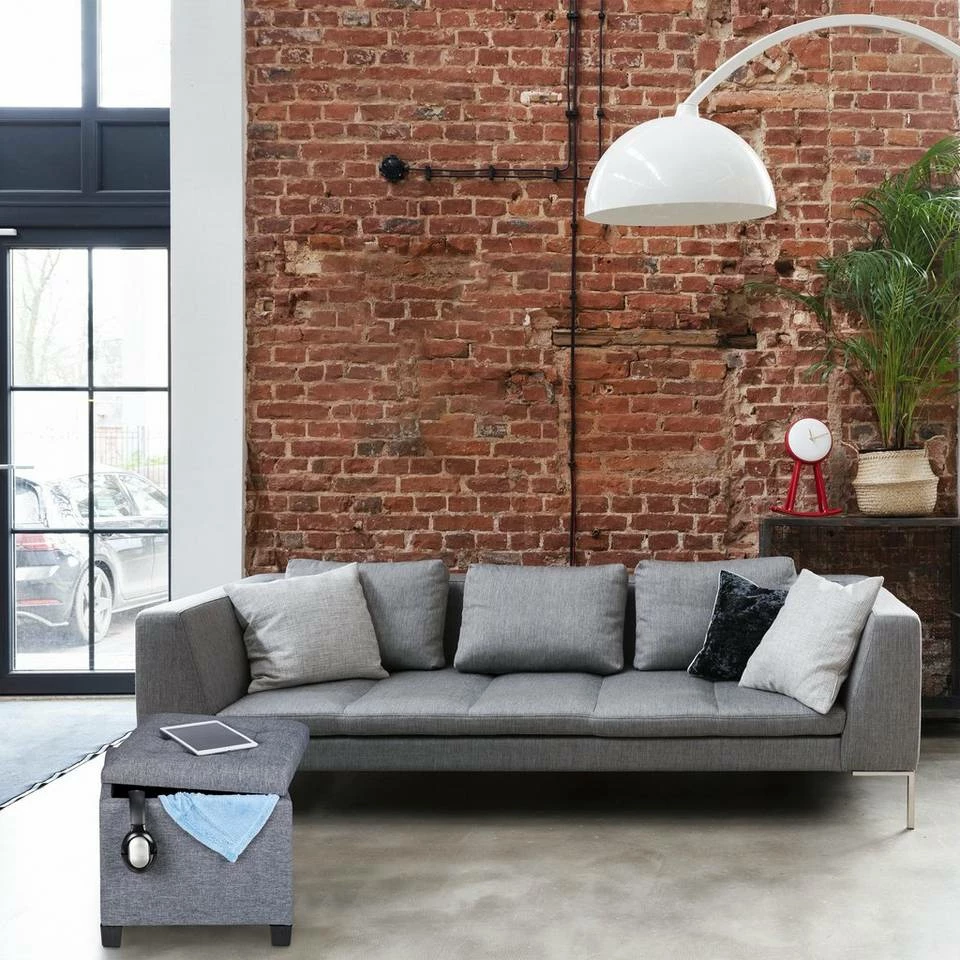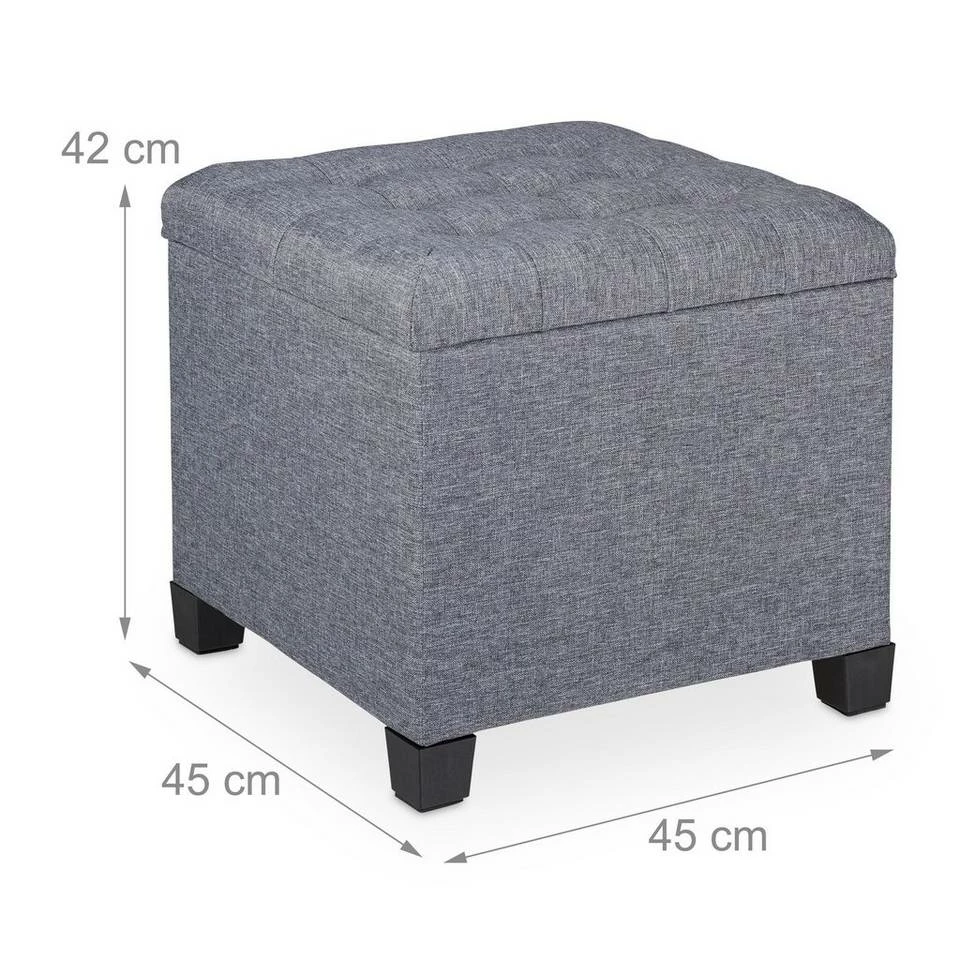 Großer Sitzhocker für das Wohnzimmer Was gibt es Schöneres, als nach einem langen Tag die Füße hochzulegen? Auf diesem Polsterhocker betten Sie Ihre Beine weich und bequem. Der große Beistellhocker mit grauem Stoffbezug ist aber nicht nur komfortabel, sondern auch funktional. So verbirgt sich unter dem dick gepolstertem Sitz ein großes Staufach für Wohntextilien, Zeitschriften oder Unterhaltungselektronik. Ob für entspannte Abende oder spontanen Besuch, der vielseitig einsetzbare Sitzhocker fügt sich dank dezentem Design überall ein.