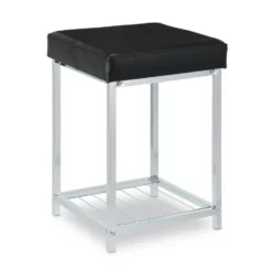 Dekorativer Beistellhocker in Lederoptik Der platzsparende Fußhocker aus verchromtem Metallgestell und schwarzem Bezug in Lederoptik setzt elegante und moderne Akzente in Deiner Einrichtung. Ein Highlight ist die Ablagefläche, welche Platz für Zeitschriften, Bücher und vieles mehr bietet. Der Polsterhocker eignet sich als Sitzgelegenheit im Wohnzimmer und Flur, aber auch als Fußablage vor dem Sofa ist der Beistellhocker ideal. Durch die Kunststoffkappen an der Unterseite ist er zudem schonend zu Deinem Fußboden.