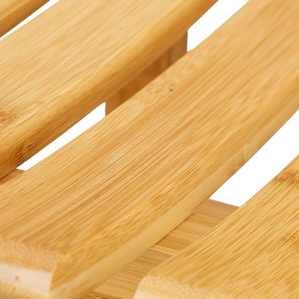 Eleganter Bambushocker Der geschwungene Hocker aus Bambus schafft mit seinem warmen Farbton und seiner leichten Bauweise eine gemütliche Atmosphäre in jedem Zimmer. Der schmale, niedrige Holzhocker eignet sich insbesondere für den Eingangsbereich. Dort bietet der Sitzhocker im skandinavischen Design eine willkommene Sitzgelegenheit für Sie und Ihre Gäste. Das langlebige Bambusholz eignet sich auch für das Badezimmer. Mit dem eleganten Schemel wirkt Ihr Bad noch einladender. Die clevere Kombination aus puristischem Design und freundlichem Holzton passt auch in Wohn-, Kinder- oder Schlafzimmer.